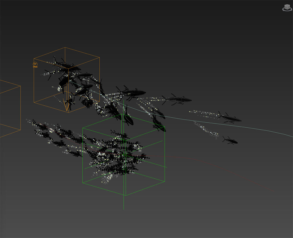 ▲tyFlowを使って骨格のバリエーションを自動生成した状態。多くの種類の魚が効率良く作成されている。また、シミュレーションで動きに追従するしくみも開発された