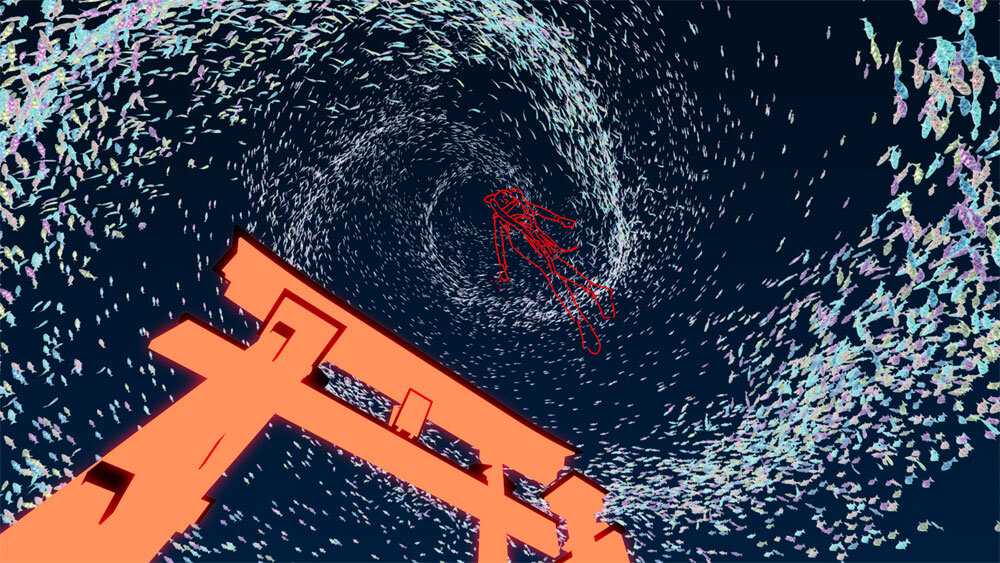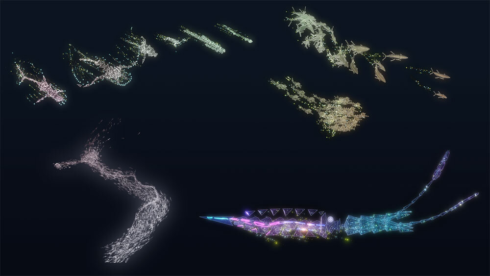 ツクヨミの世界を彩る「ツクヨミ魚」は、3ds MaxのtyFlowを使って作成されている。人間の深層心理を反映したデザインというコンセプトを基に、スティミュラスイメージでデザインから制作された。ツクヨミ魚は様々な形態が用意されており、それぞれのアニメーションはループ素材になっているため、撮影時に魚群の密度を自由に増減させることも可能だ。