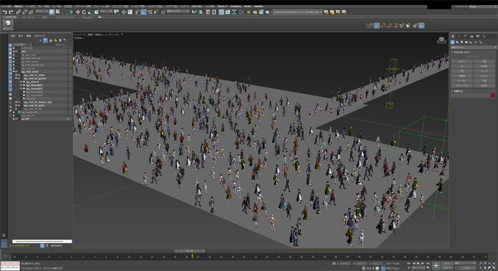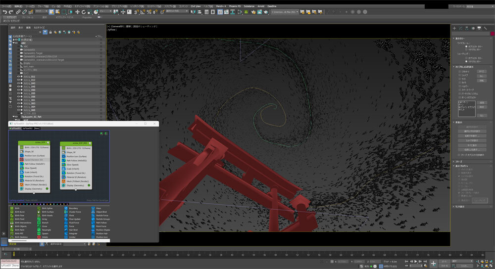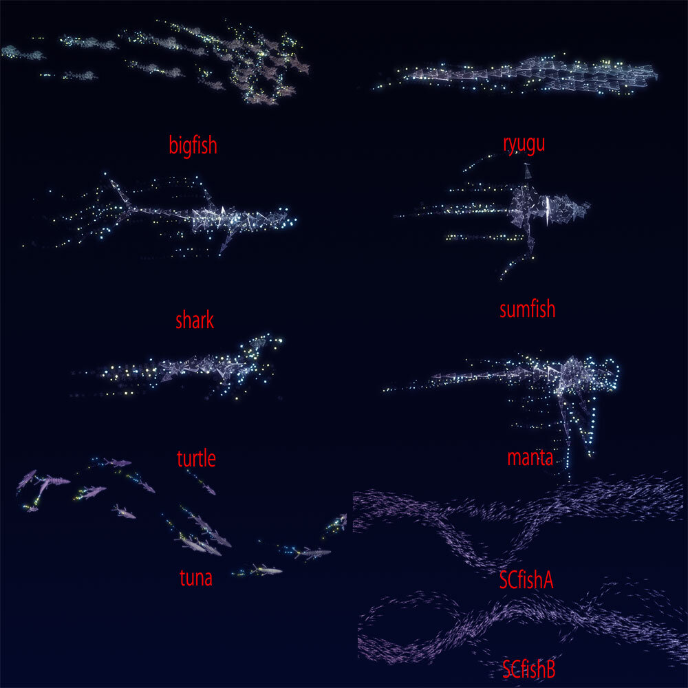以下はライブステージに現れる「ライブ魚」の例。ライブ魚は群れでの行動が主体なので群れの軌跡をパスで作成し、tyFlowのPath Followを使って軌道を描きながら動くようなしくみがつくられ、魚群が制御されている。