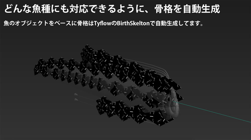 ▲tyFlowを使って生成したツクヨミ魚の骨格。骨格はBirth Skeltonで自動生成したものを使用している -