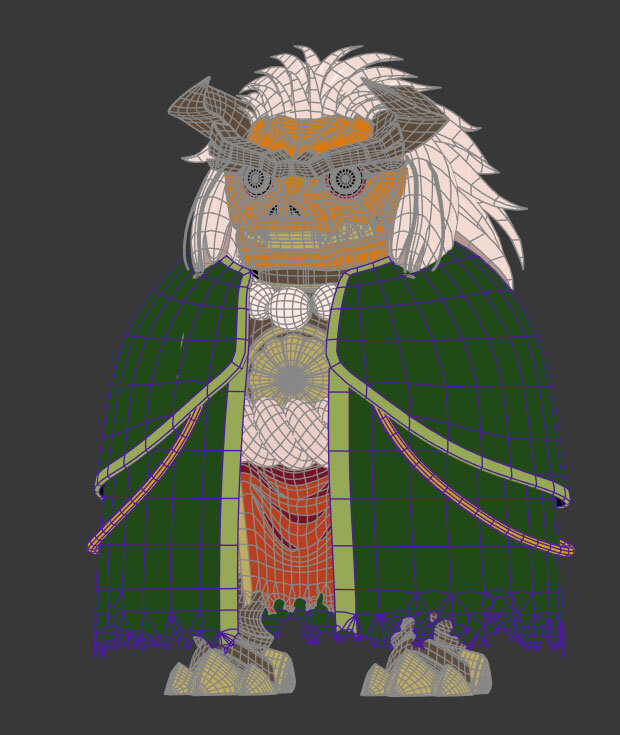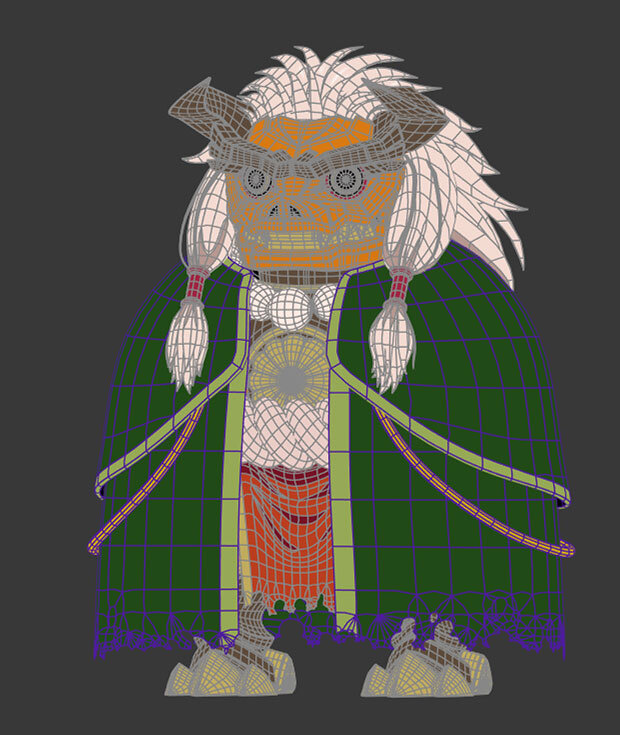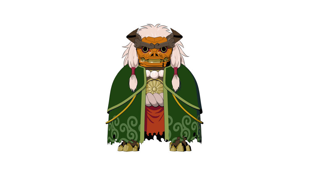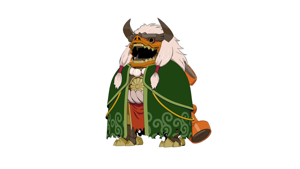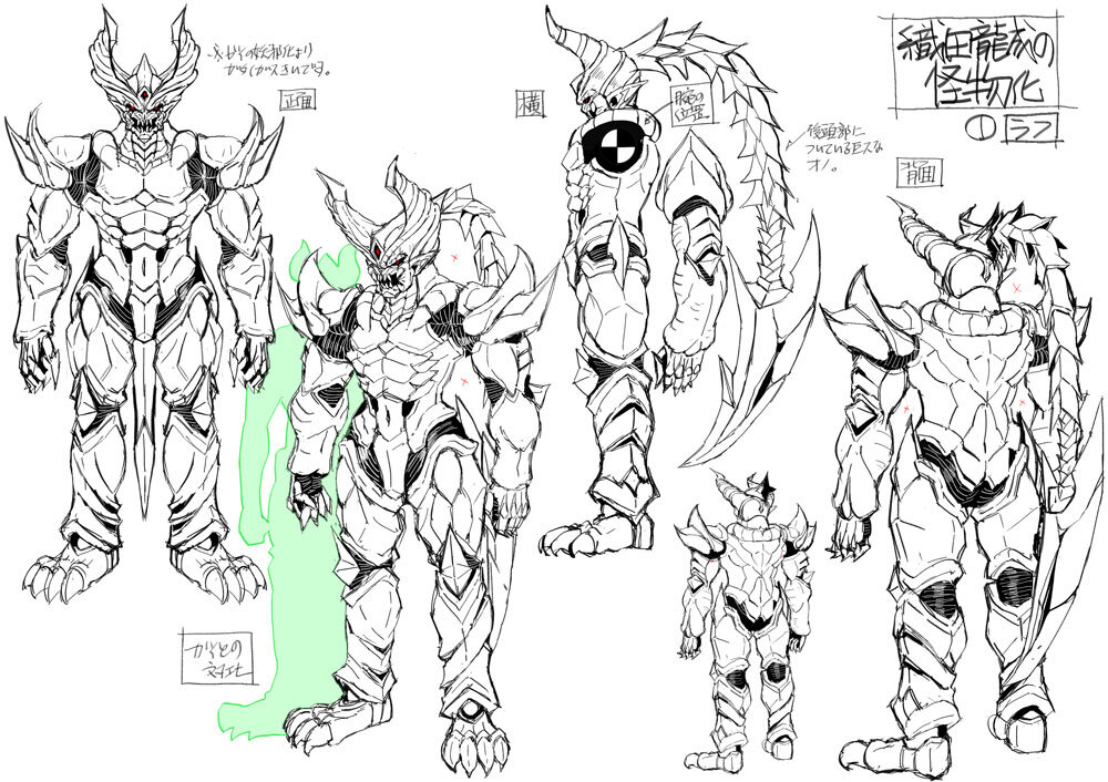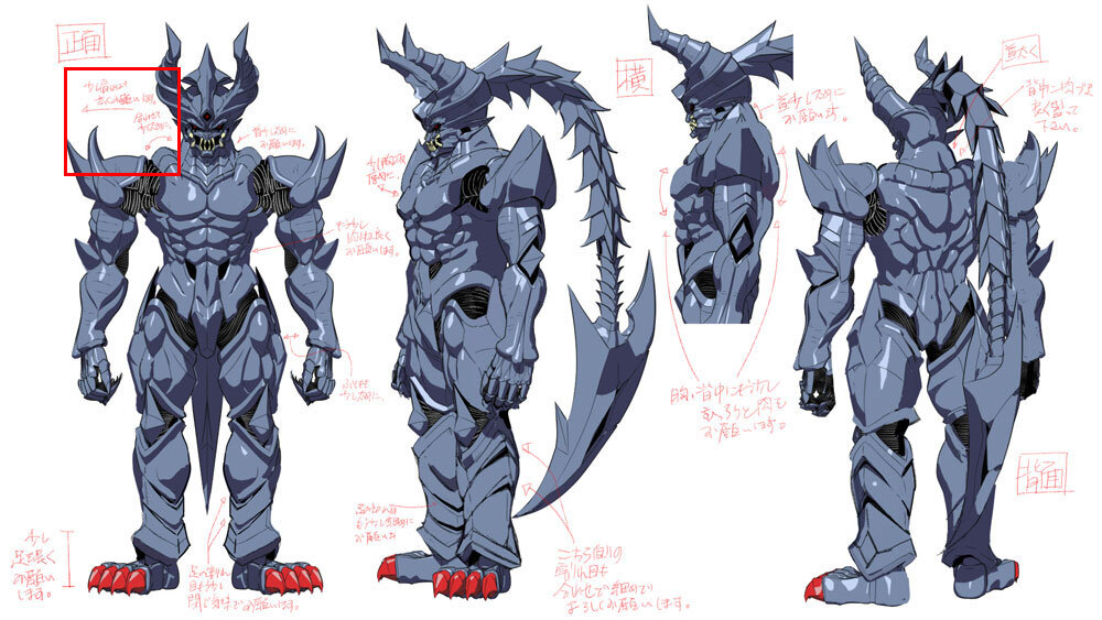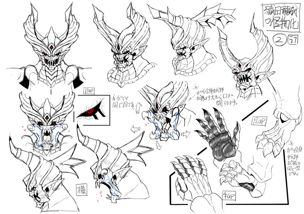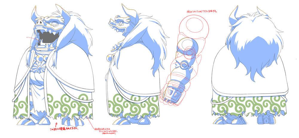 敵キャラクターである十勇士の1人、イサニュードーは特にボディの造形に力を入れたキャラクターだという。イサニュードーは2D設定画のほかに、頭部の立体造形資料が提供され、立体のディテールの把握に役立てられている。ラフモデルがアップされた時点で、兄であるセイカイニュードーとの共通点を増やしたいということになり、デザイン変更が発生したため、その対応も必要だった。