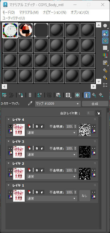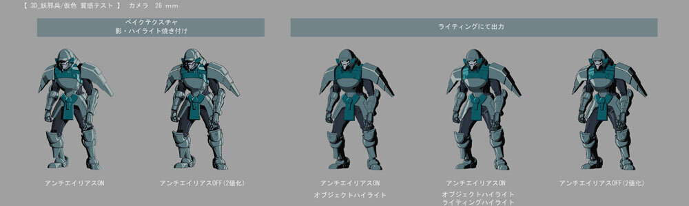 作画に寄せたルックを実現する際に、当初は顔とボディで別々に画像パスを出力する予定だったが、結果として顔とボディをひとつにまとめ、出力される画像パスを5つの要素に集約することで、後工程での工数削減とコストダウンが実現されている。マテリアルとラインの生成には3ds MaxのPencil+を使用し、スキャンラインレンダラのレンダーエレメントを使って各要素が出力された。