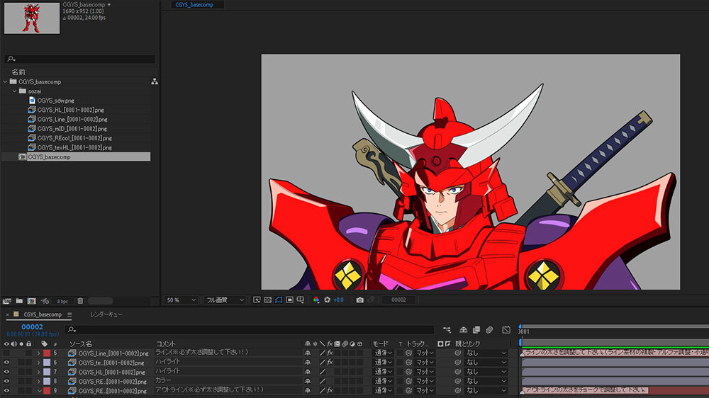 「監督からの要望で、戦闘シーンではフルCG、序盤の日常芝居ではボディは3DCGで、顔は作画を合成したいということだったので、なるべく3DCGの質感を削って、作画と合わせたときの違和感が生じにくいルックになるように調整しています。そうすることで出力する素材数も削減でき、結果的にアニメーション付けや撮影といった後工程でも工数を削減できました。また、ベースモデルのポリゴン数を必要最低限に抑えることで、制御しやすくなり、ほかのサムライトルーパーへの流用や加工をスムーズに行うこともできました」とCGモデリングディレクターの小伊豆玲衣氏。