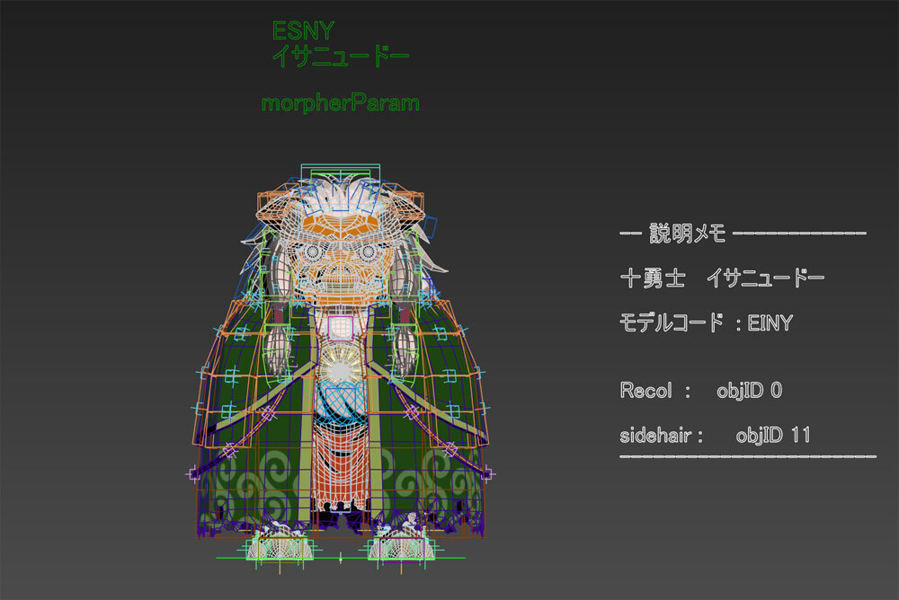 イサニュードーはマントに髪の毛がかかっているデザインのため、マントの脱着時に横髪が干渉してしまう。この問題については、マント表示状態での横髪形状のモーフターゲットを作成し、モーフを使って回避している。