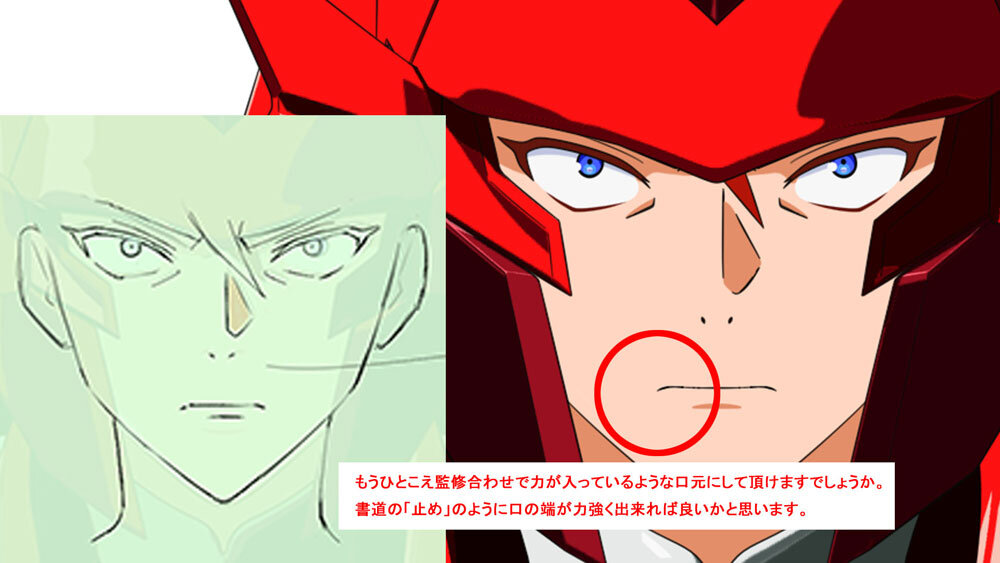 多数のターゲットが用意されているため、ある程度はターゲットを使ってベースの表情をつくれるが、細かい部分はアニメーターの手作業とスキルによるところが大きく、フェイシャルは本作でアニメーターが特に力を入れた部分だという。この武蔵が踏まれているときの表情も1コマ1コマ修正しながら、作画に近い感覚でフェイシャルアニメーションが作成されている。