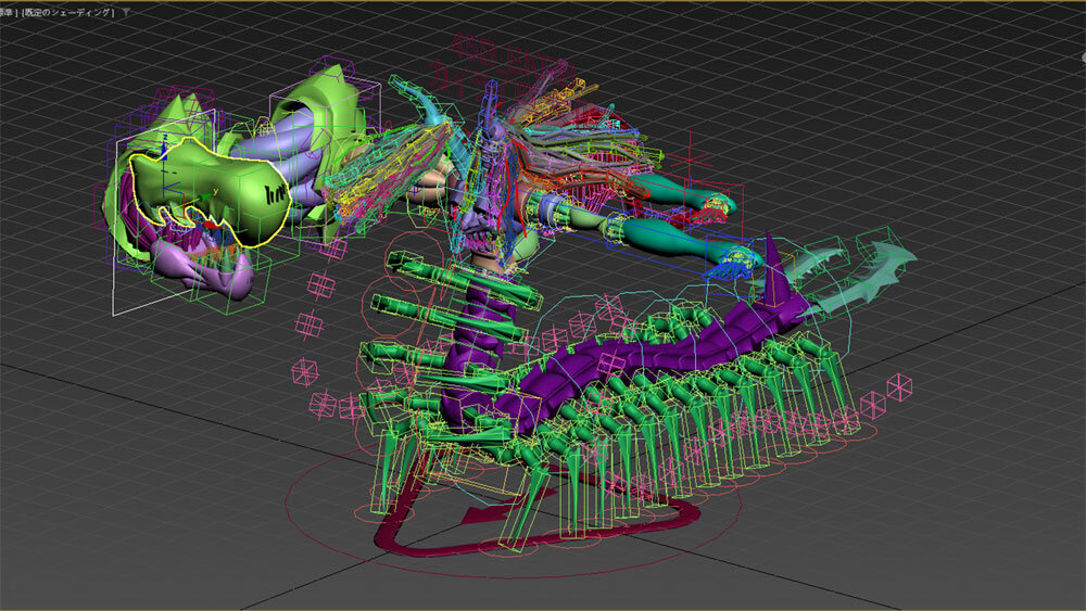 キャラクターモデルのリグはそのキャラクターの種類によって異なり、人型のキャラクターの場合はBiped、モンスター系の“カイライ” などはCATを使ってセットアップされている。メインキャラクターのリグはアクションに対応させるため、ベースリグのほかに、手足の伸縮用のリグも追加され、ケレン味のあるアニメ的誇張表現にも対応可能だ。