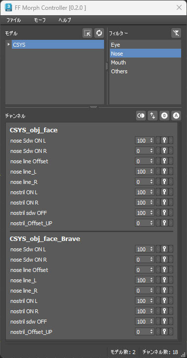 本作では非常に多くのモーフターゲットが作成されており、表情のリストが多くて制御が難しいため、社内システムによってモーフを部位ごとに分けて制御しやすくするスクリプトを開発し、効率化が図られている。画像はモーフコントローラのUIだ。部位ごとに形状変形やライン、影の状態などをパラメータで設定することができるようになっている。