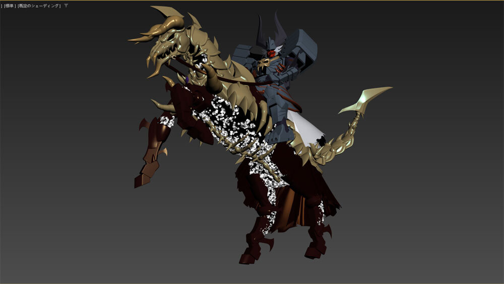 妖邪帝王の羅真我が乗る馬の胴体から放出されるエフェクトの例。エフェクト制作には主にtyFlowが使われている。カットによってはAEの2D的なエフェクトが使用されているが、3D的に動くカットの場合は、tyFlowでエフェクトの雛型を作成して対応しているという。