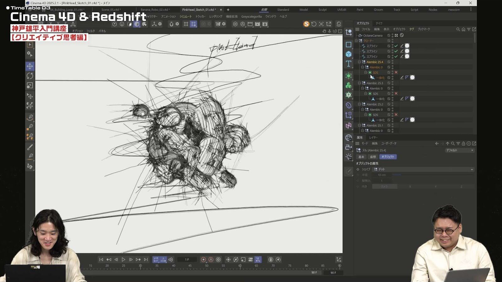 神戸:Cinema 4Dユーザーにはお馴染みのGreyscalegorilla(同ツールのトレーニングやアセットなどを提供するMAXONのパートナー企業)のチュートリアルにこういうタッチの作例があって。すごいですよね、Sketch and Toonでレンダリングするだけでもうこれが出てくるという。「これはとんでもなく自分好みだな」と。それと、ポリゴンには細かくディスプレイスメントを加えていて、ノイズのアニメーションを適用してるので、勝手に線が揺れて動いてくれるんです。