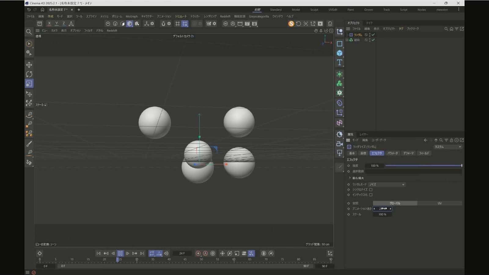 そこで知って感動したのが「破砕」です。適当につくったオブジェクトに破砕を入れて、MoGraphの「ランダム」でエフェクタのランダムモードを「ノイズ」にして、「アニメーション速さ」を調整すると、ちょっとだけランダムに動いてくれる。ライブの演出映像とかで1枚でドーンと出したオブジェクトに、ちょっとだけ動いててほしい時によく使ってます。