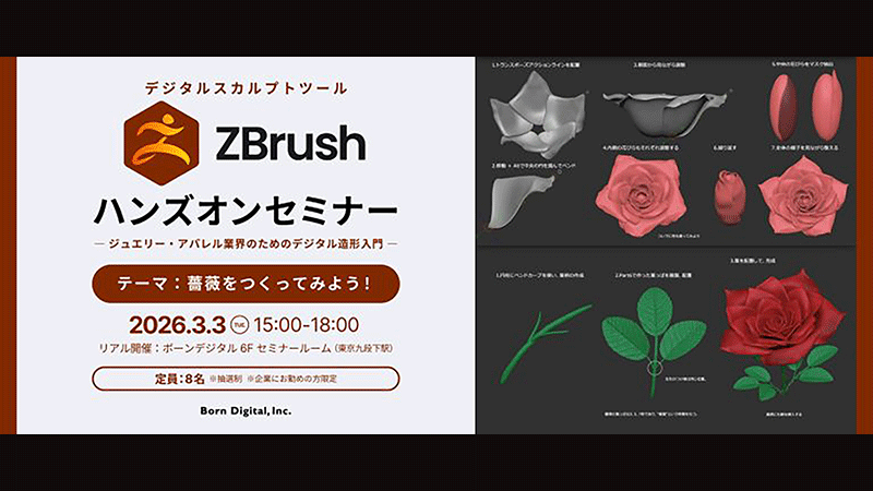 本セミナーは、デジタルスカルプトツール「ZBrush」を使って、ジュエリー・アパレル業界の方向けに、デジタル造形を体験いただくハンズオンセミナーです。