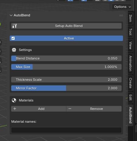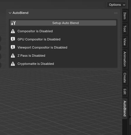 アドオンのインストール後に現れるAutoBlendパネルで「Setup Auto Blend」を実行すると、シーンに必要な設定が自動構成され、コンポジットノードが組まれる。セットアップの終了後はパネル内容が変化し、ブレンドが利用可能となる。「Add」ボタンからブレンド対象のマテリアルを追加する。なお、AutoBlendはオブジェクトではなくマテリアルに対して割り当てが行われるため、同じマテリアルを使用している他のオブジェクトもブレンド対象となる。また、マテリアル名を変更した場合は、再度割り当て直す必要がある。