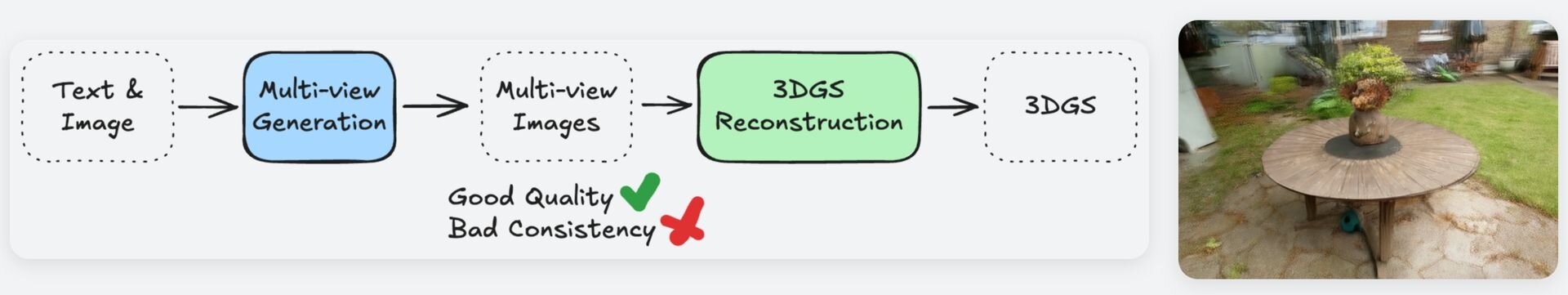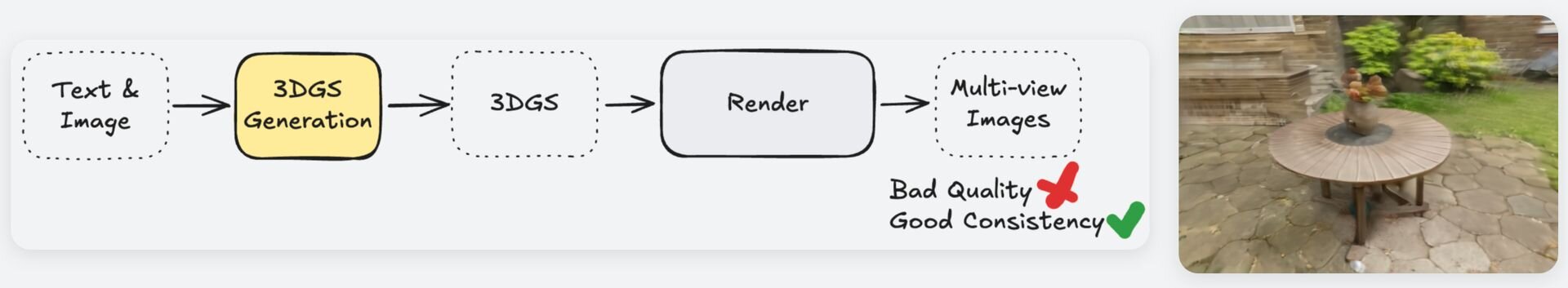 「FlashWorld」は、従来の3Dシーン生成技術の主要アプローチである「多視点指向(Multi-view-oriented、MV-oriented)パイプライン」(一貫性に問題あり)と「3D指向(3D-oriented)パイプライン」(ビジュアル品質が低い)という問題を解決するため、独自の学習戦略を採用した3Dシーン生成AIモデル。