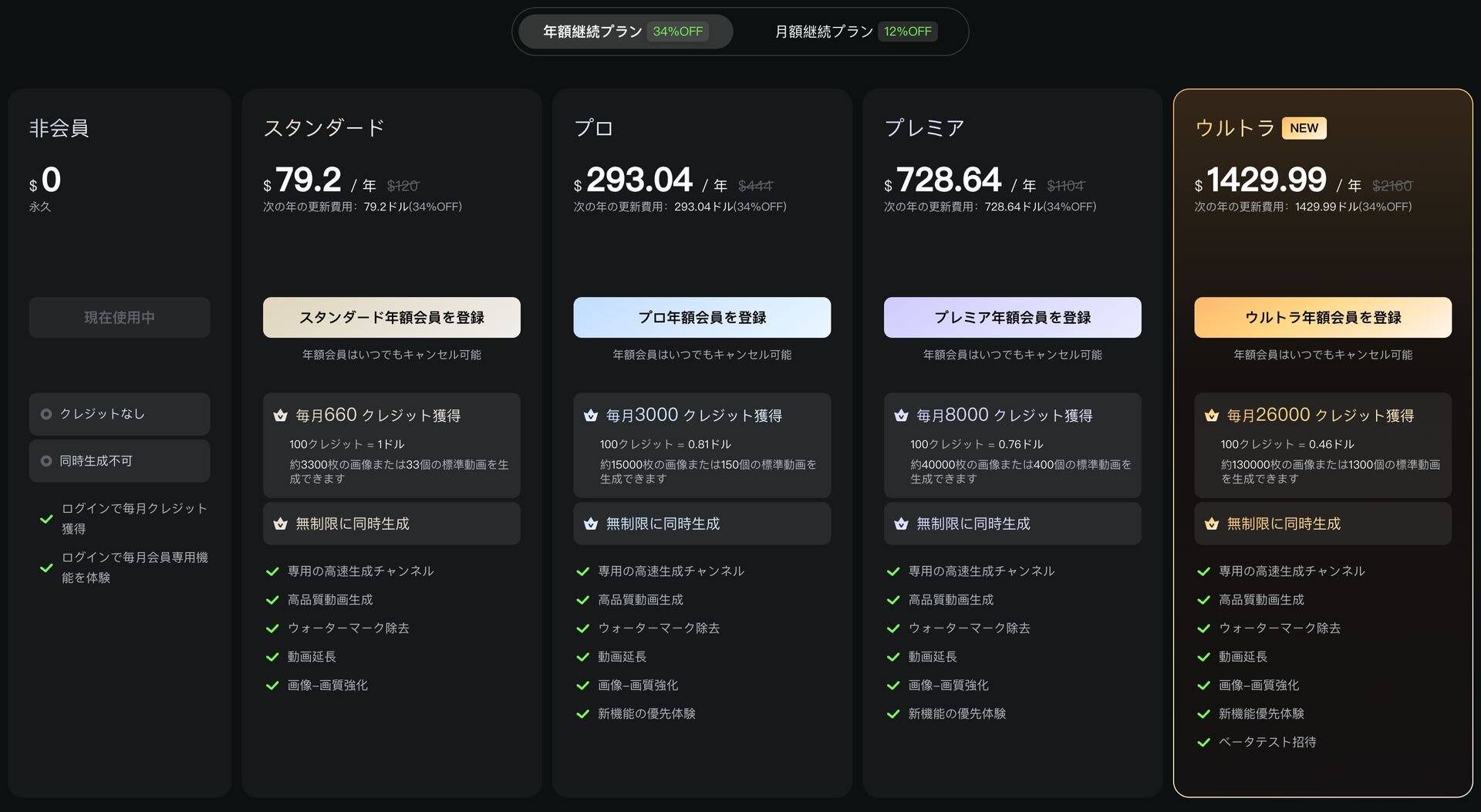 Klingは無料プランのほか、スタンダード(年払い、割引適用で79.2ドル、約11,750円)、プロ、プレミア、ウルトラの4種有料プランを備える。商用利用にはいずれかの有料プランが必要となる。