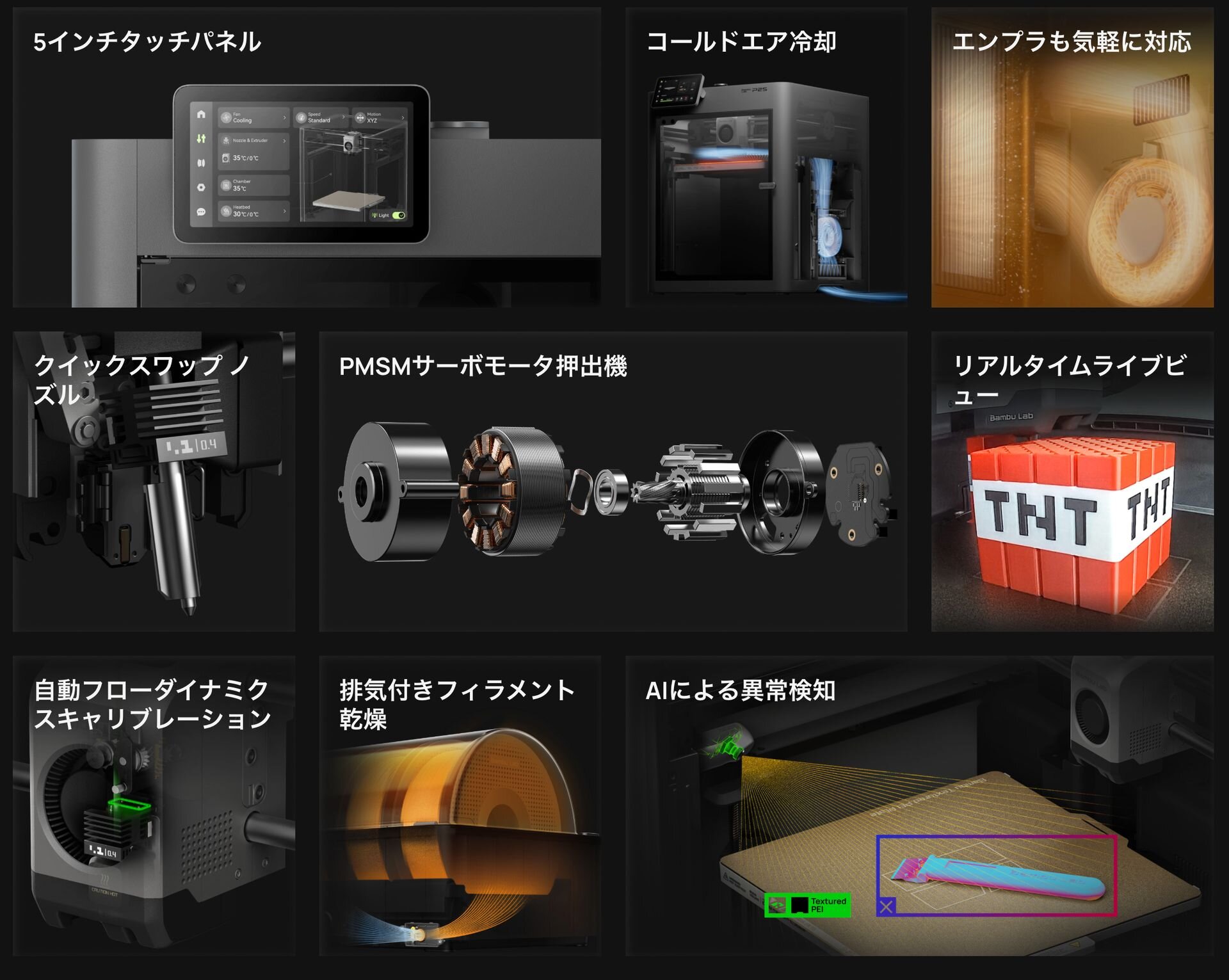 AIによる異常検知機能も搭載。「スパゲッティ」や「ノズルの盛り上がり」といった一般的な造形トラブルを能動的に検知するほか、プリント開始時の設定もAIが確認し、安全で正確なスタートをサポートする。