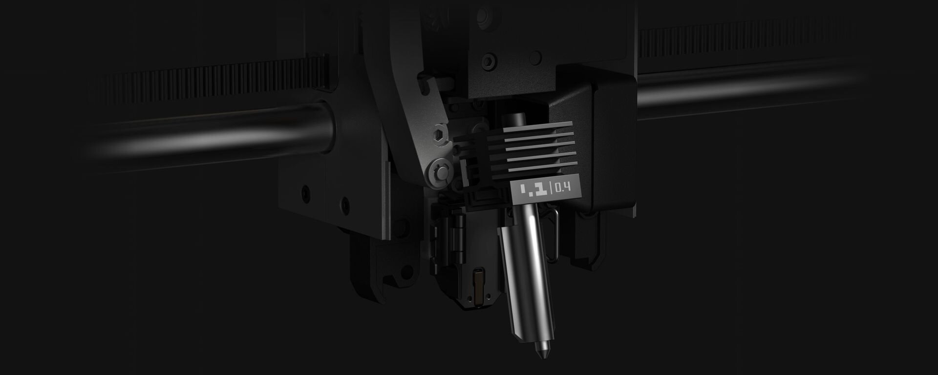 メンテナンス面ではクイックスワップ式ホットエンドを採用。ワンクリップ機構により、配線を外すことなく約30秒でノズルとヒートシンク全体を交換できる。ノズルと押出ギアは硬化鋼(焼入れスチール)でつくられ、炭素繊維やガラス繊維を含む「繊維強化材」の造形にも対応する高い耐久性を持つ。また、PMSMフィーディングモーターにより、フィラメントの送り速度が60%向上。フィラメント交換時間を短縮する。