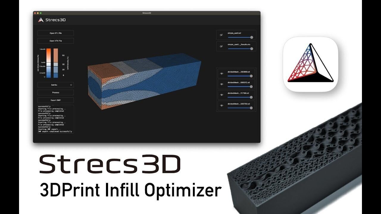 タム氏が、応力解析(Stress Analysis)の結果に基づいてインフィル(内部充填構造)の密度を調整することで、軽量かつ剛性の高い3Dプリントデータを実現する前処理ソフト「Strecs3D」を、オープンソース(BSD 3-Clauseライセンス)で公開。WindowsとMacに対応する。
