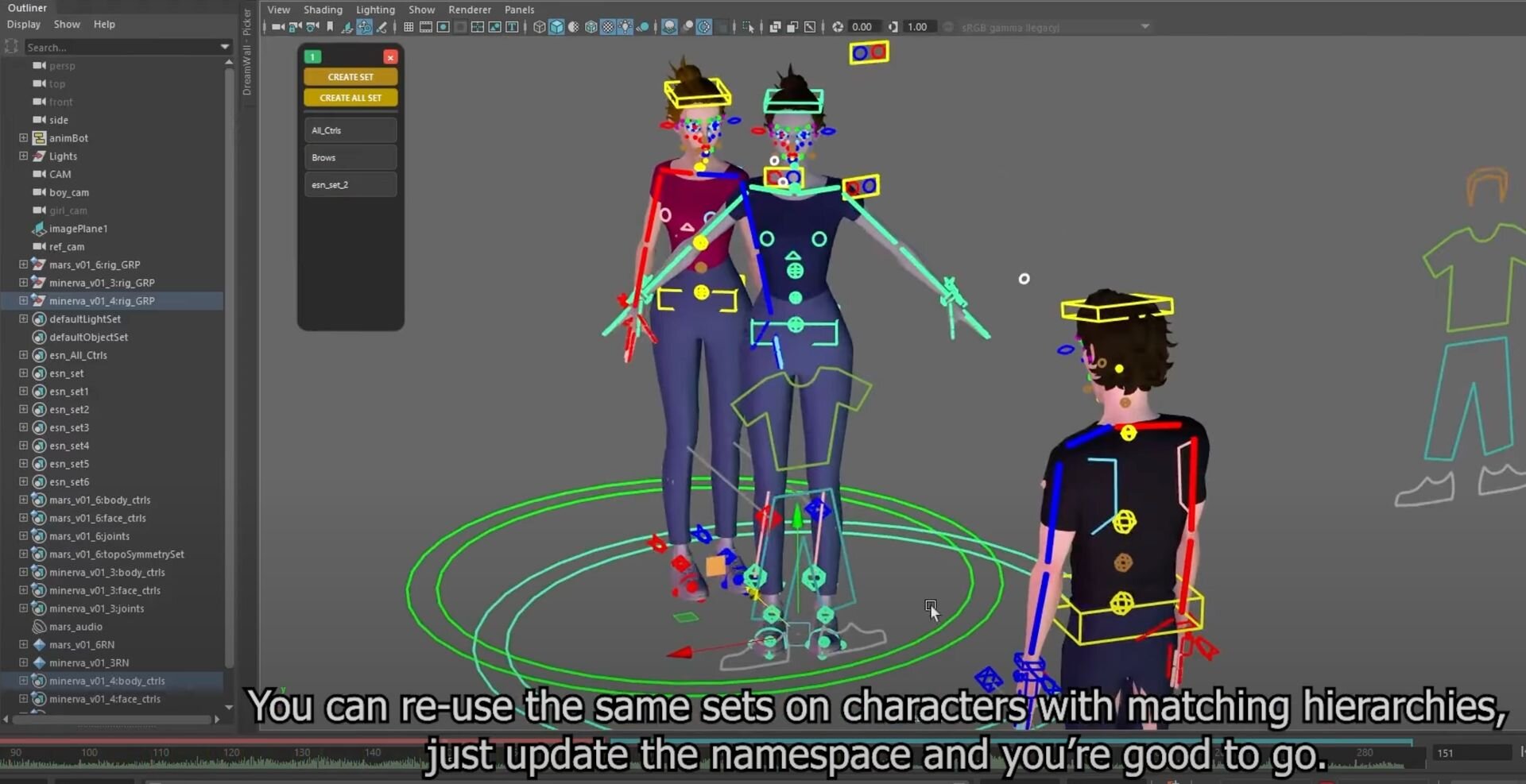 頻繁に使用するコントロールのグループは「選択セット(selection set)」として保存でき、ホットキーを割り当てて素早く呼び出すことが可能。作成した選択セットはファイルとしてエクスポートし、他のMayaシーンにインポートすることで再利用できる。異なる名前空間(Namespace)を持つキャラクターにセットを適用する場合でも、簡単な操作で名前空間を更新してセットを再利用できる。