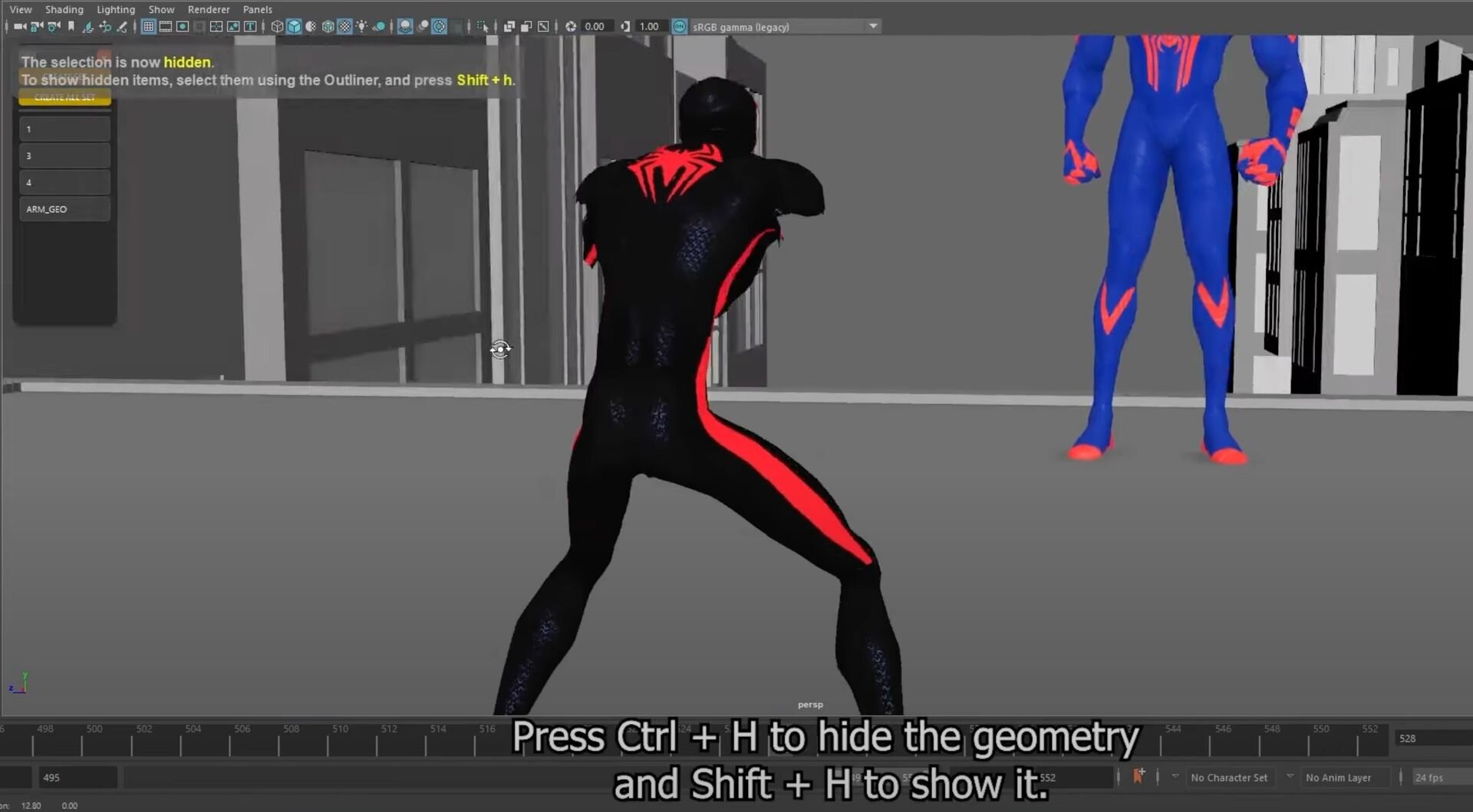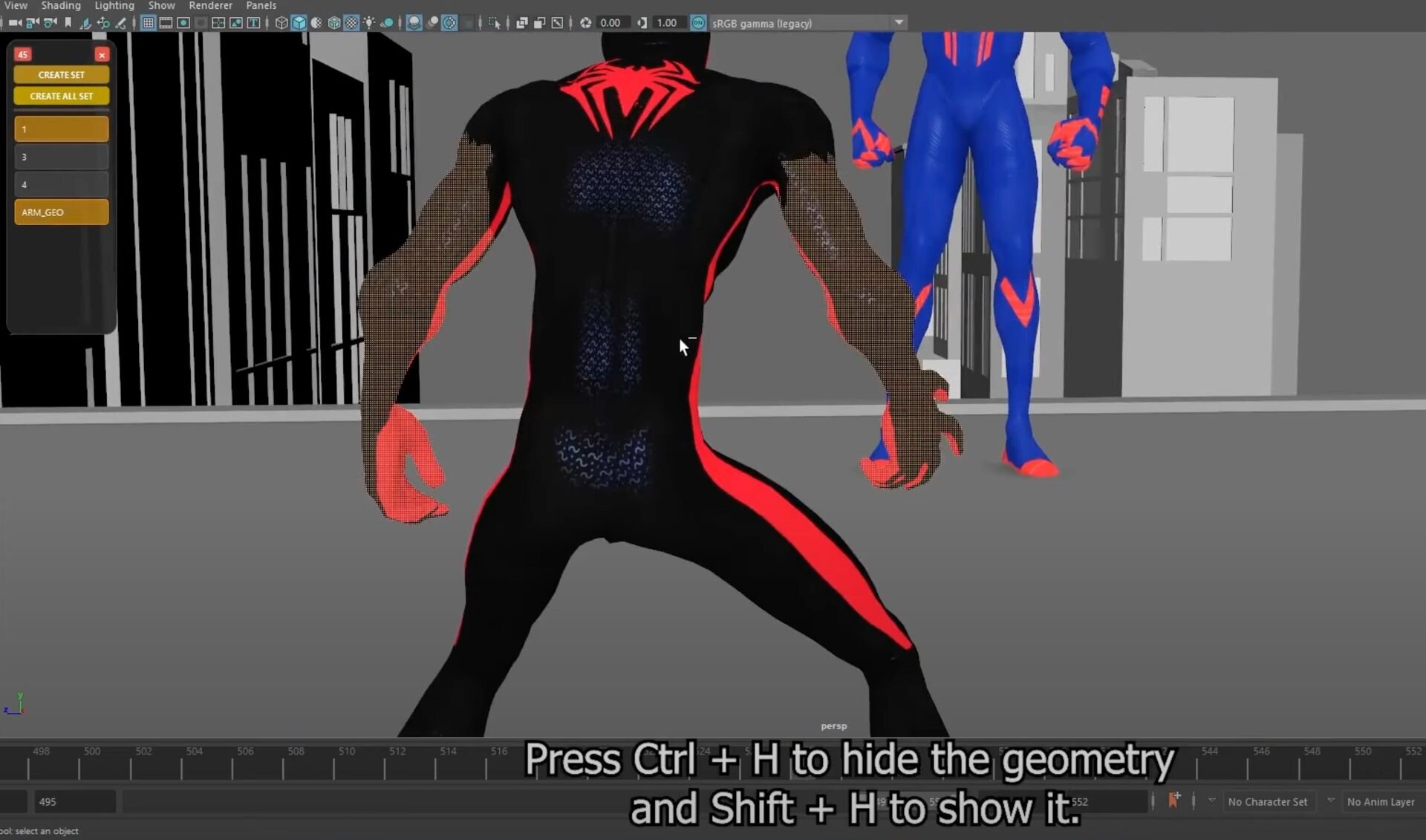 また、キャラクターのジオメトリの特定のセクションを選択セットに追加すると、アニメーション作業中に邪魔になる部分を一時的に非表示にすることができる。これにより、アニメーションのポーズ調整やフェイシャルアニメーション作業が効率化できる。