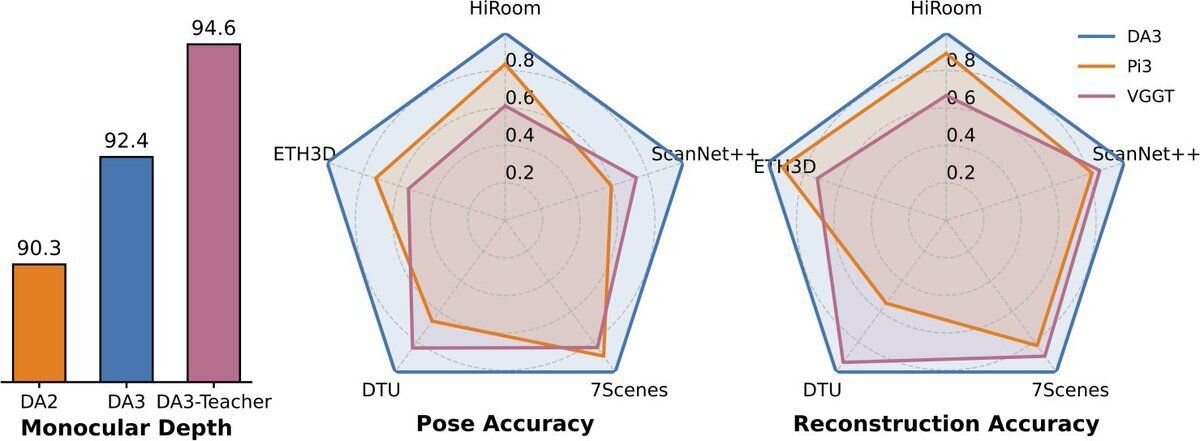 There are multiple abilities enabled by Depth Anything 3:私たちは、カメラポーズ推定、任意視点ジオメトリ(TSDF再構成)、そして視覚的レンダリングを網羅する、新たな視覚幾何学ベンチマークを確立しました。