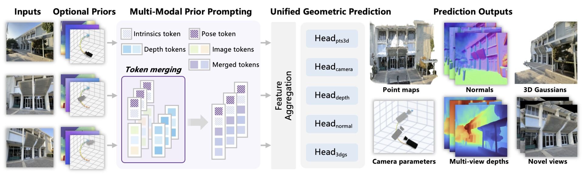 ・Any Input, Maximized Flexibility and Fidelity: Flexibly integrates diverse geometric priors (camera poses, intrinsics, depth maps) to resolve structural ambiguities and ensure geometrically consistent 3D outputs.