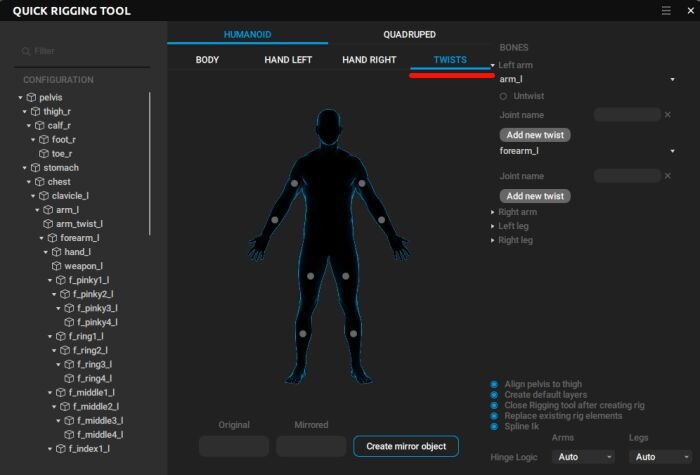 ラグドールシミュレーションにおいては、関節の角度制限(Angle Constraints)が設定可能となり、キャラクターがあらぬ方向に曲がってしまう現象を防げるようになった。また、Quick Riggingツールがツイストボーンに対応し、Daz StudioやCharacter Creatorなどで作成した複雑なリグのキャラクターセットアップが容易になっている。