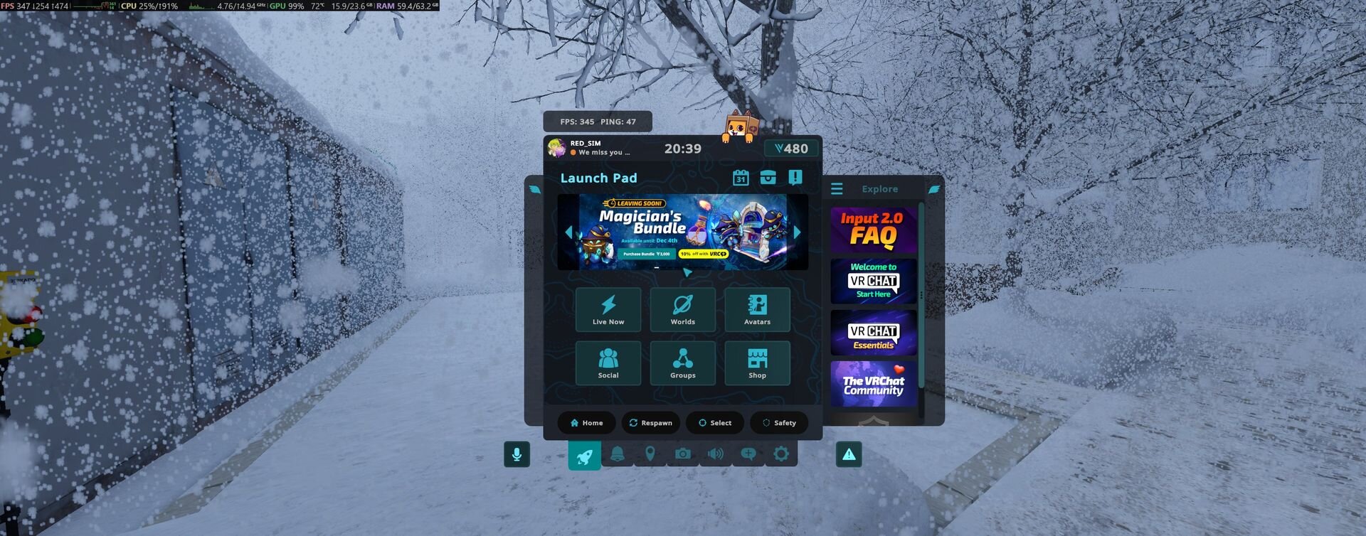 今回リリースされた「GPU Snow - GPU Particle Volumes」シェーダは、GPU Particle Volumesの実用性を証明する最初のパッケージとなる。先述のVRC Light Volumesへの対応により、舞い散る雪の粒ひとつひとつが、ワールド内に配置されたライティングの影響を正確に受ける。街灯の下を通過する雪は明るく照らされ、暗がりでは沈むといった、環境光とパーティクルの相互作用が物理的に正しく描画される。