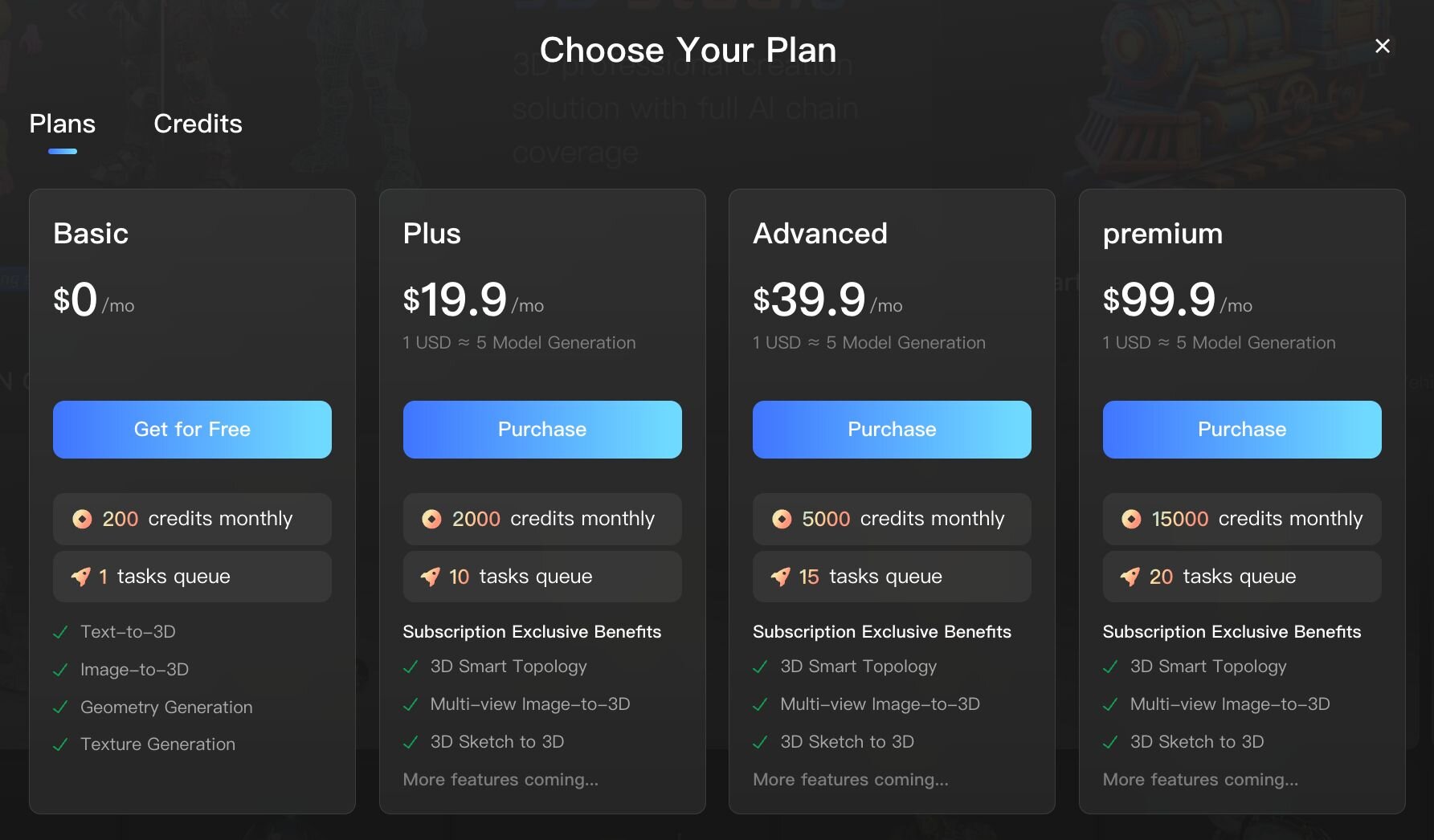 Hunyuan 3D Engineには無料のBasicプランをはじめ、Plus、Advanced、Premiumという4つのプランが用意されている。Basicプランは無料で利用できるが毎月200クレジットが付与され、タスクキュー(同時実行枠)は1つ。月額19.9ドル(約3,100円)のPlusプランは、毎月2,000クレジットが付与されタスクキューが10枠に拡張される。有料プランは3D Smart Topology、マルチビューImage-to-3D、Sketch to 3Dが利用可能だが、Basicプランでも1日20回付与される無料生成で利用できる。