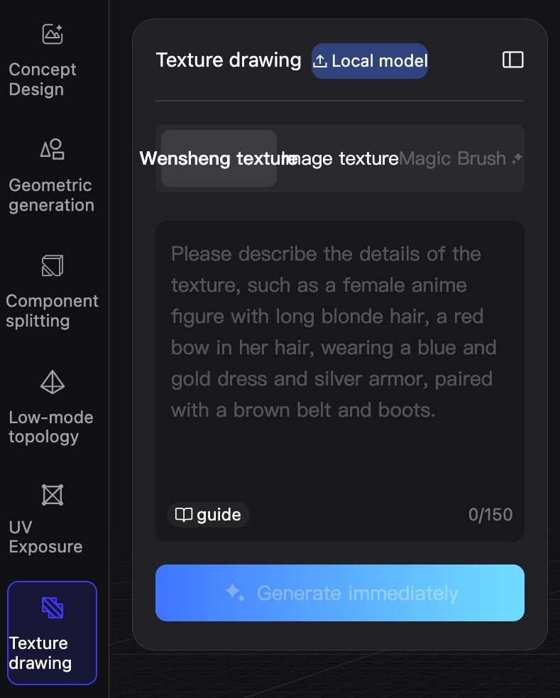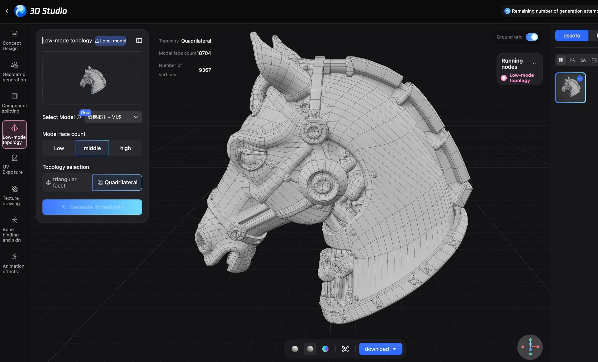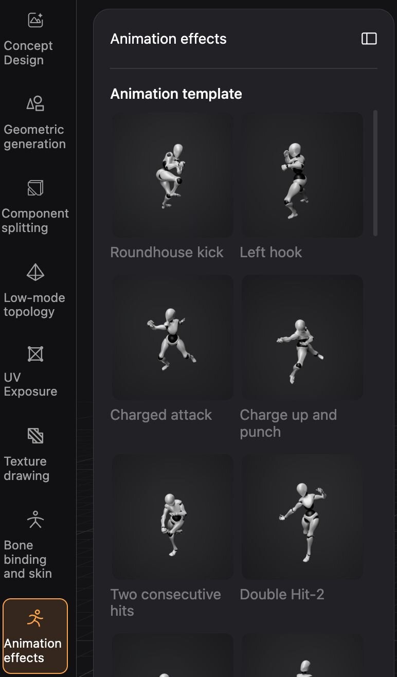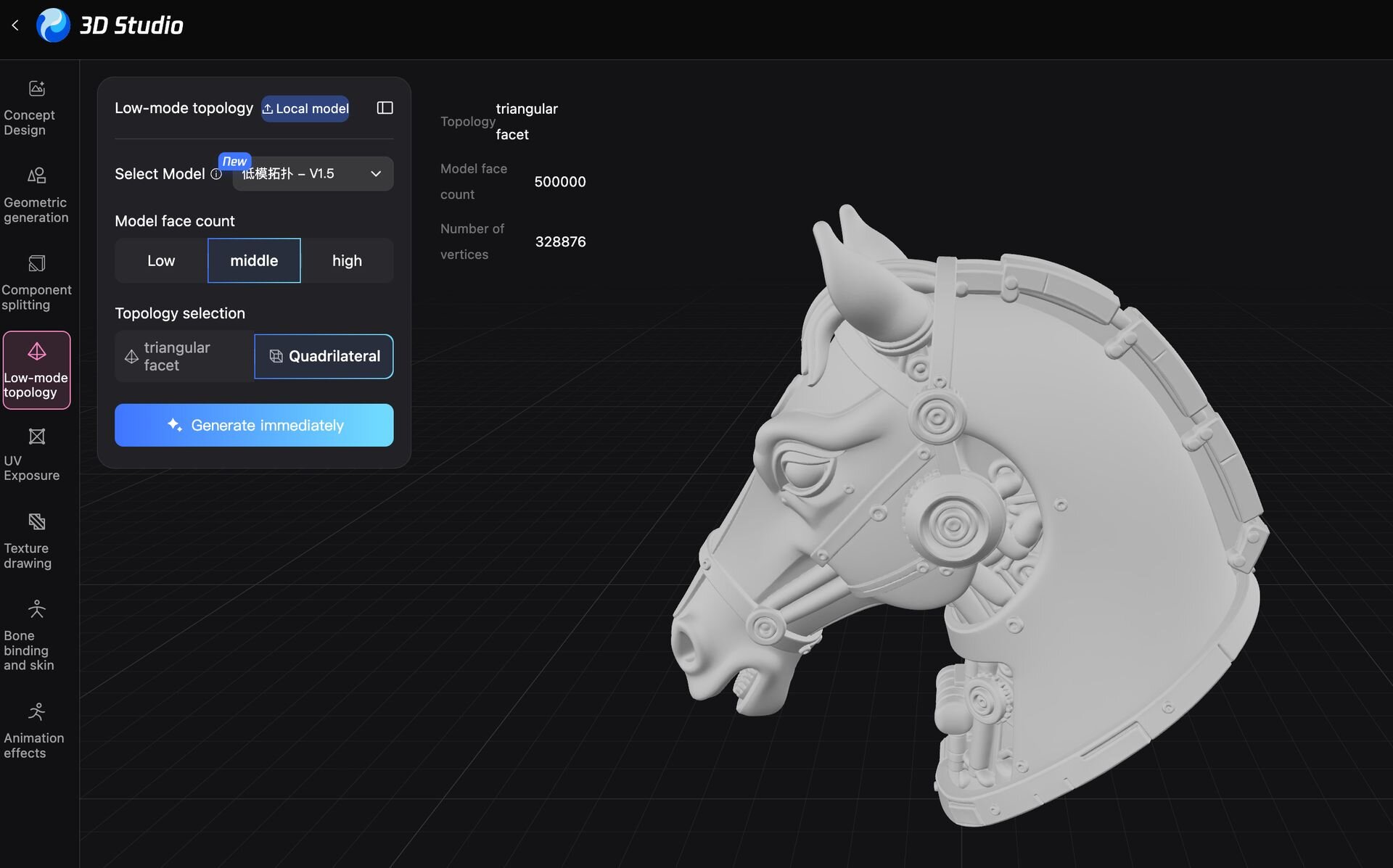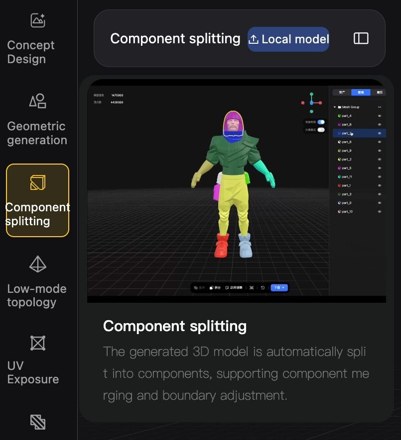 ▲Hunyuan3D Studioには「Concept Design」「Geometric generation」「Component splitting」「Low-mode topology」「UV Exposure」「Texture drawing」「Bone binding and skin」「Animation effects」という8つの工程が用意されている。バージョン1.1で変更があったのは4番目の工程となる「Low-mode topology」で旧モデルPolyGen 1.1と新モデルPolyGen 1.5が選択可能となっている