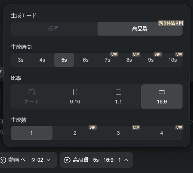 無料で利用できる非会員(Basic)プランは、ログインすることで毎月会員専用機能を体験できる権利が付与されるが、システムの混雑時には生成ができないほか、「VIP」表記のある有料プラン向けオプションは利用できない。