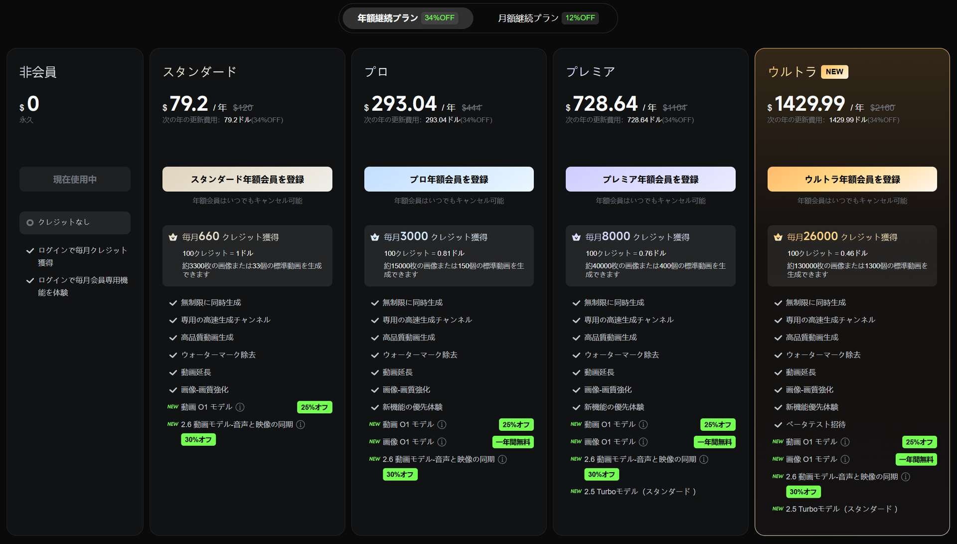 スタンダード(Standard)プランは年額79.2ドル(約12,335円)で提供され、毎月660クレジット付与。無制限の同時生成、専用の高速生成チャンネル、高品質動画の生成、ウォーターマークの除去などが含まれる。