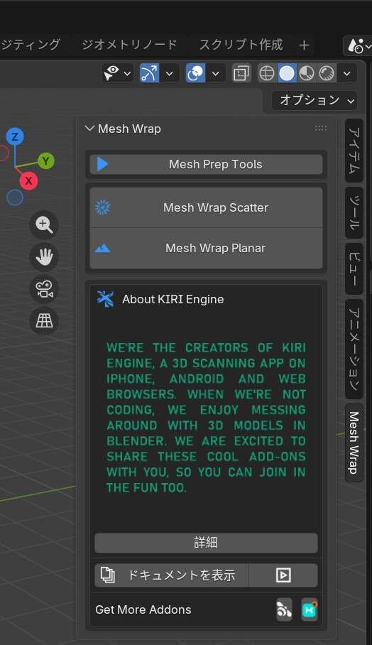 ▲インストールはダウンロードしたZIPファイルをBlenderのビューポートにドラッグ&ドロップするだけ。サイドバーからアドオンにアクセスできる -