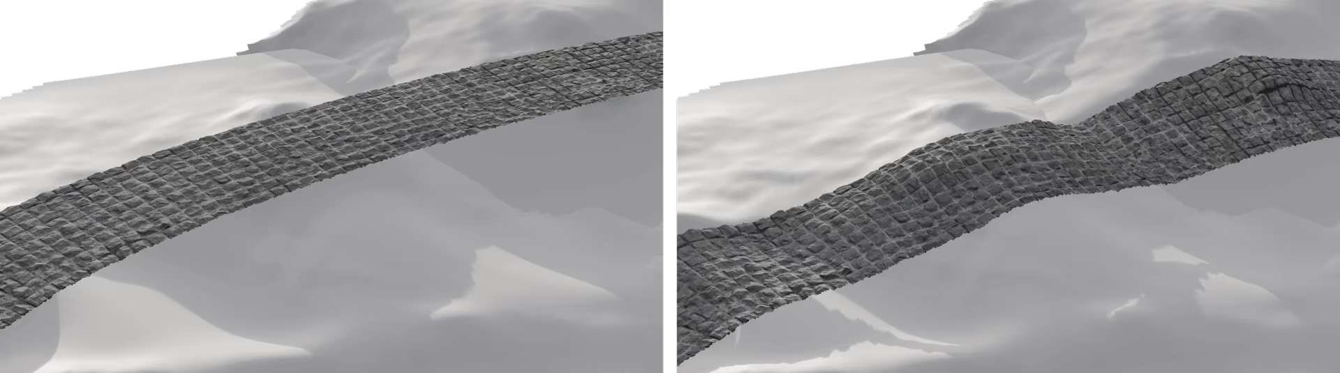 ▲事前調整を行わずにラップ処理を行った結果、メッシュに対して浮いている例(左)と、事前調整を行ったためメッシュに沿ったラップ処理が行えた例(右)