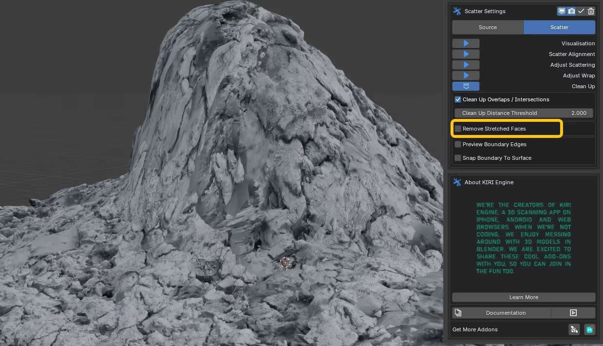 散布によって生じる不自然な重なりや引きつりを修正するクリーンアップ機能として、無理に引き伸ばされたポリゴン面を自動検出し、しきい値に基づいて削除するRemove Stretched Faces機能が用意されている。また、ベースメッシュのノーマル(法線)を一時的に滑らかにするBlur Surface Normals機能により、急激な角度変化によるアーティファクトの発生を抑制することもできる。