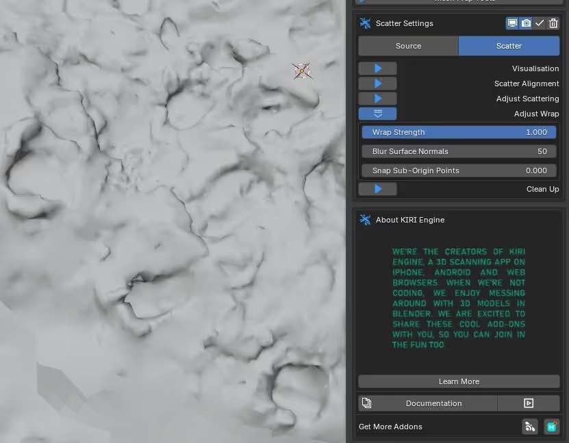 アドオンの利用にあたっては、Mesh Wrapが地形やサーフェスのスキャンデータ(Surface Scans)に最適化されているため、閉じた立体形状(Manifold meshes)に対して使用した場合、予期せぬ結果を招く可能性がある点に注意が必要だ。また、高解像度のスキャンデータを大量に散布(スキャッター)する場合、ポリゴン数が数百万単位に膨れ上がり、パフォーマンスに影響を及ぼす恐れがある。そのため、ポリゴン数を削減するデシメート(Decimate)モディファイアーによる最適化が不可欠となる。