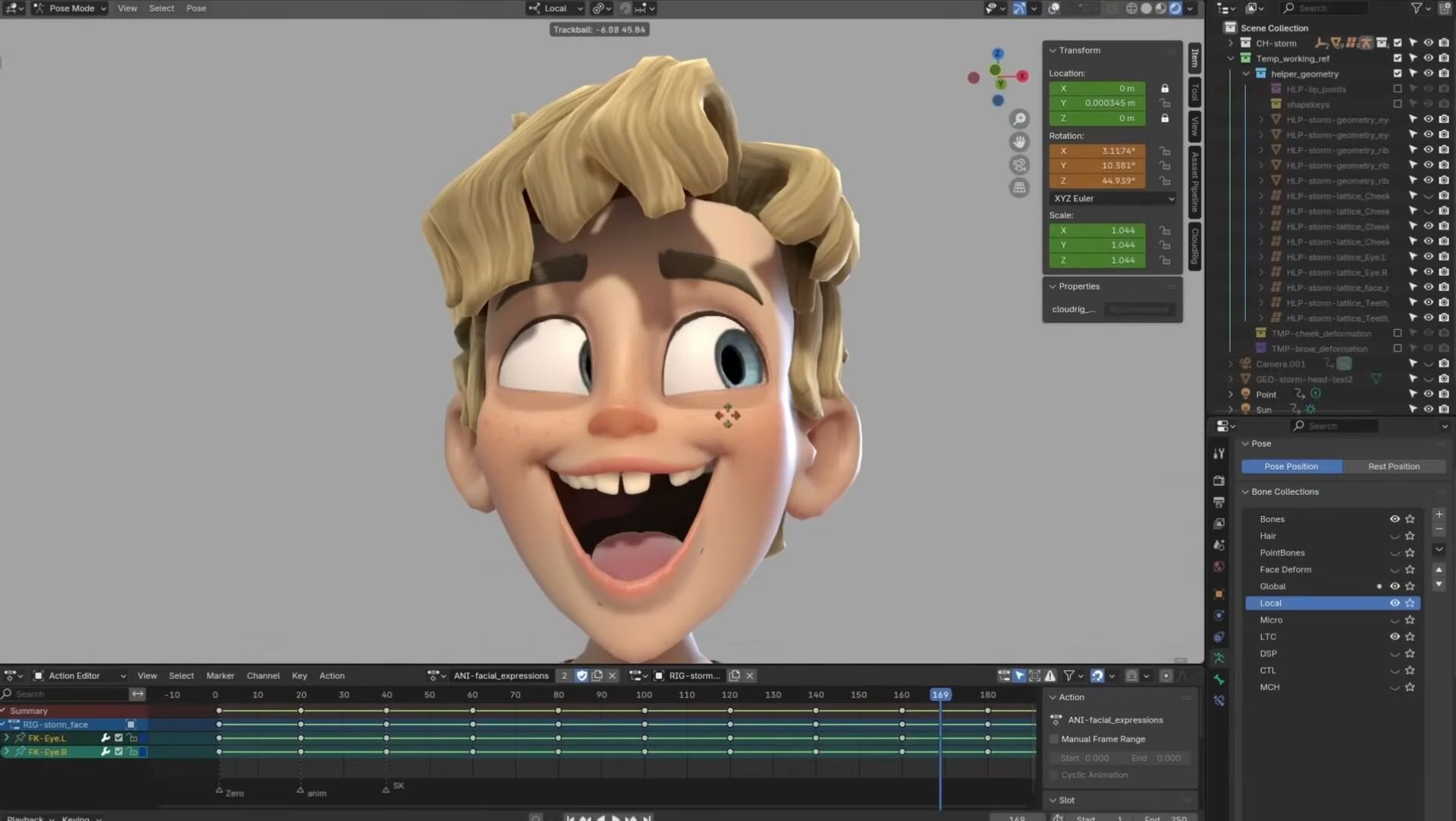 ボディリグはDemeter Dzadik氏によるBlenderアドオン「CloudRig」を用いて構築されている。このリグは、四肢のワールド座標変換を維持したままFKとIKモードをシームレスに切り替え可能。また、ヒンジやペアレンティングのオプション、微調整用のTweakボーンなど、柔軟なアニメーション制作に必要な機能が多数搭載されている。