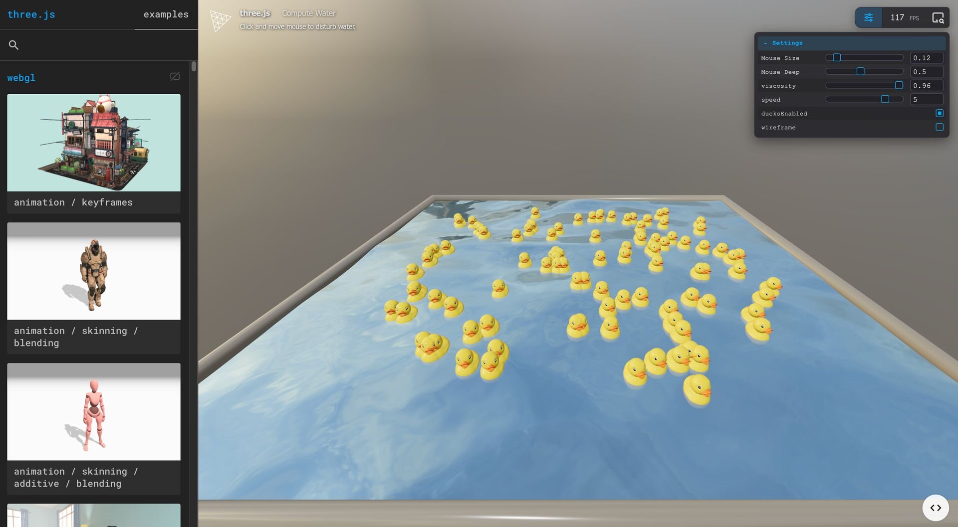 次世代の描画API「WebGPU」への対応として、サンプル「Fixed WebGPU compute water」では、GPUの計算能力を汎用計算に利用するコンピュートシェーダを用いた水面シミュレーションを確認できる。