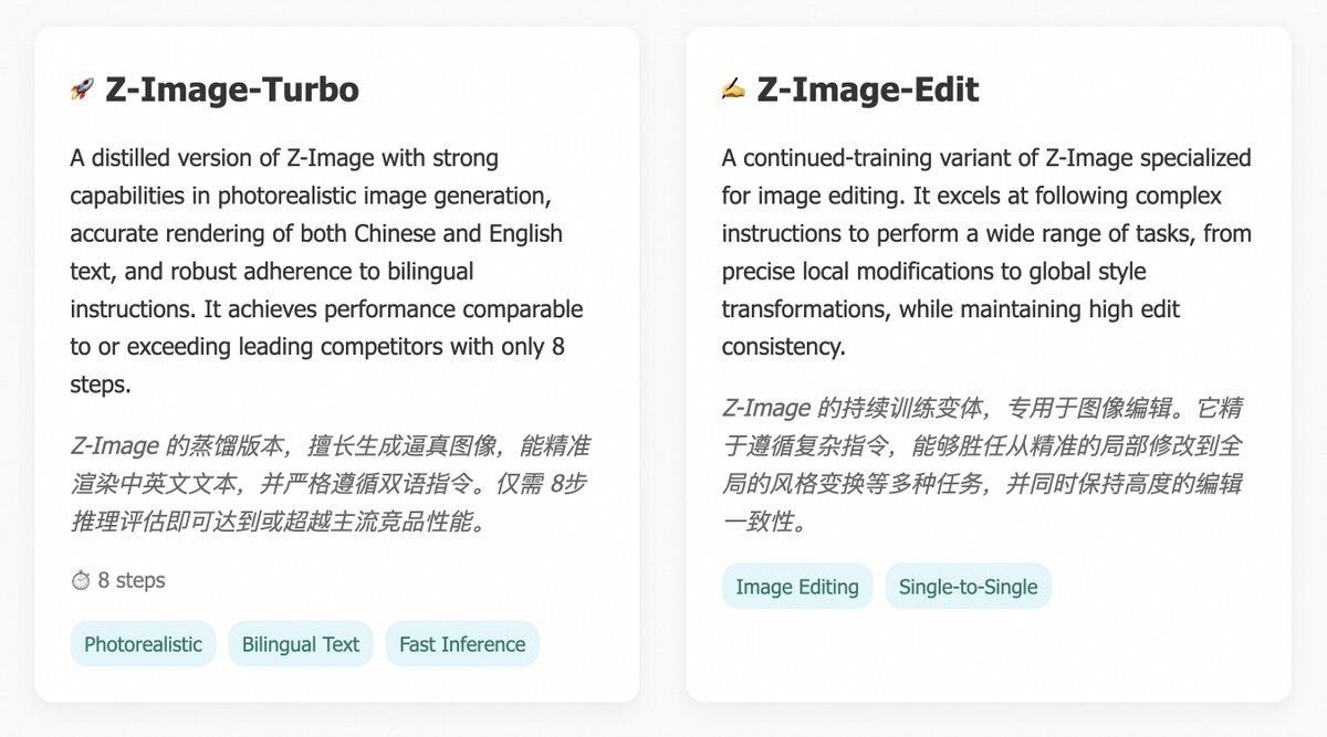 今回、Z-Imageをベースとした2つの特化型モデル、生成用の「Z-Image-Turbo」(公開済み)と編集用の「Z-Image-Edit」(公開予定)をリリースします。