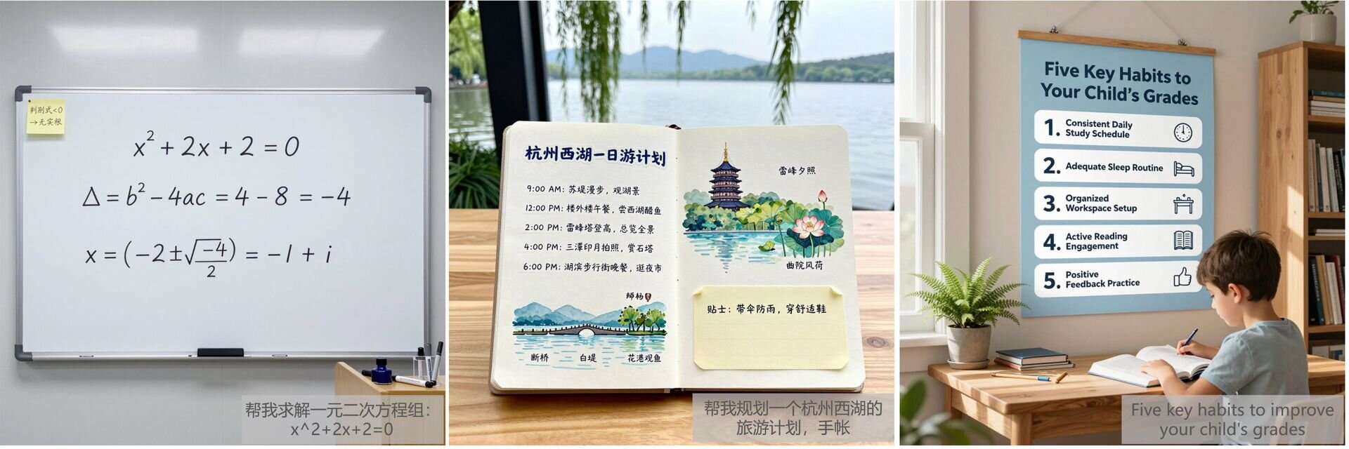 Deep Semantic Understanding with Priori Knowledge: The powerful prompt enhancer (PE) uses a structured reasoning chain to inject logic and common sense, enabling the model to handle complex tasks like the "chicken-and-rabbit problem" or visualizing classical Chinese poetry. In editing tasks, even when faced with ambiguous user instructions, the model can apply its reasoning capabilities to infer the underlying intent and ensure a logically coherent result.