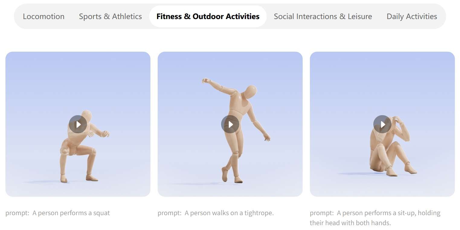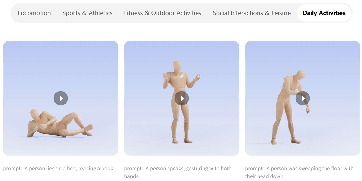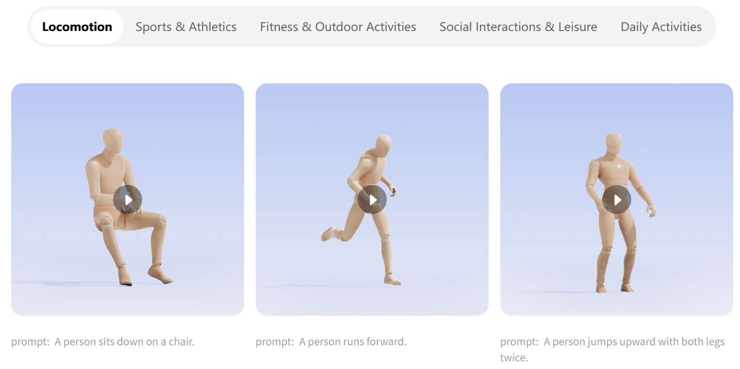 学習プロセスは3段階で構成されている。まず、3,000時間を超える多様なモーションデータを用いた大規模な事前学習によって基本的な動きのパターンを習得。次に、400時間の高品質な3Dモーションデータを用いて微調整(Fine-tuning)を行い、動きの細部や滑らかさを向上させている。最後に、人間のフィードバックによる強化学習(Reinforcement Learning from Human Feedback:RLHF)を適用し、テキストの指示に対する理解度と動作の自然さをさらに洗練させたとのことだ。
