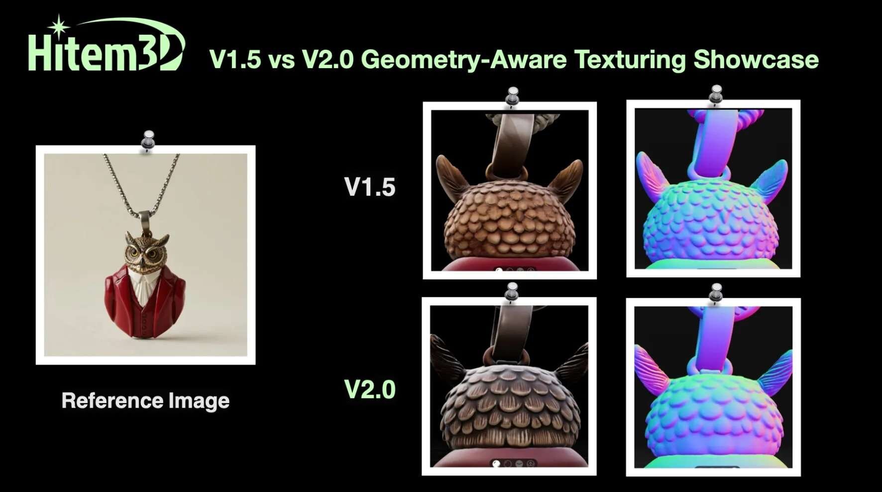 Hitem3D 2.0には独自の「1536pro」統合テクスチャリングモデルが搭載され、立体的なジオメトリとテクスチャを同期させて生成する。これにより、裏面や遮蔽された部分も自動的に補完され、触手や動物の尻尾といった細長い形状であっても、継ぎ目や歪みが大幅に低減され、連続性のある自然な外観が得られるようになったという。また、色彩の変化が表面形状に密着して追従することから、従来よりもより有機的かつ生命感のあるモデルを生成できるとのこと。