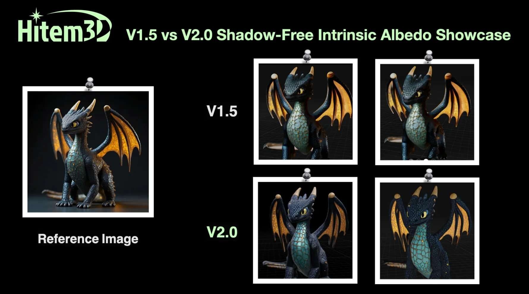 3Dアセットの実用性向上のため、Hitem3D 2.0ではIntrinsic Albedo(本来の色)の抽出技術を採用。写真から3Dモデルを生成する際の課題である、オリジナル画像に含まれるライティングやシャドウの情報がテクスチャに焼き付いてしまう現象に対して、V2.0では専用のデライティングモデルを適用することにより、ライティングとシャドウの影響を除去する。