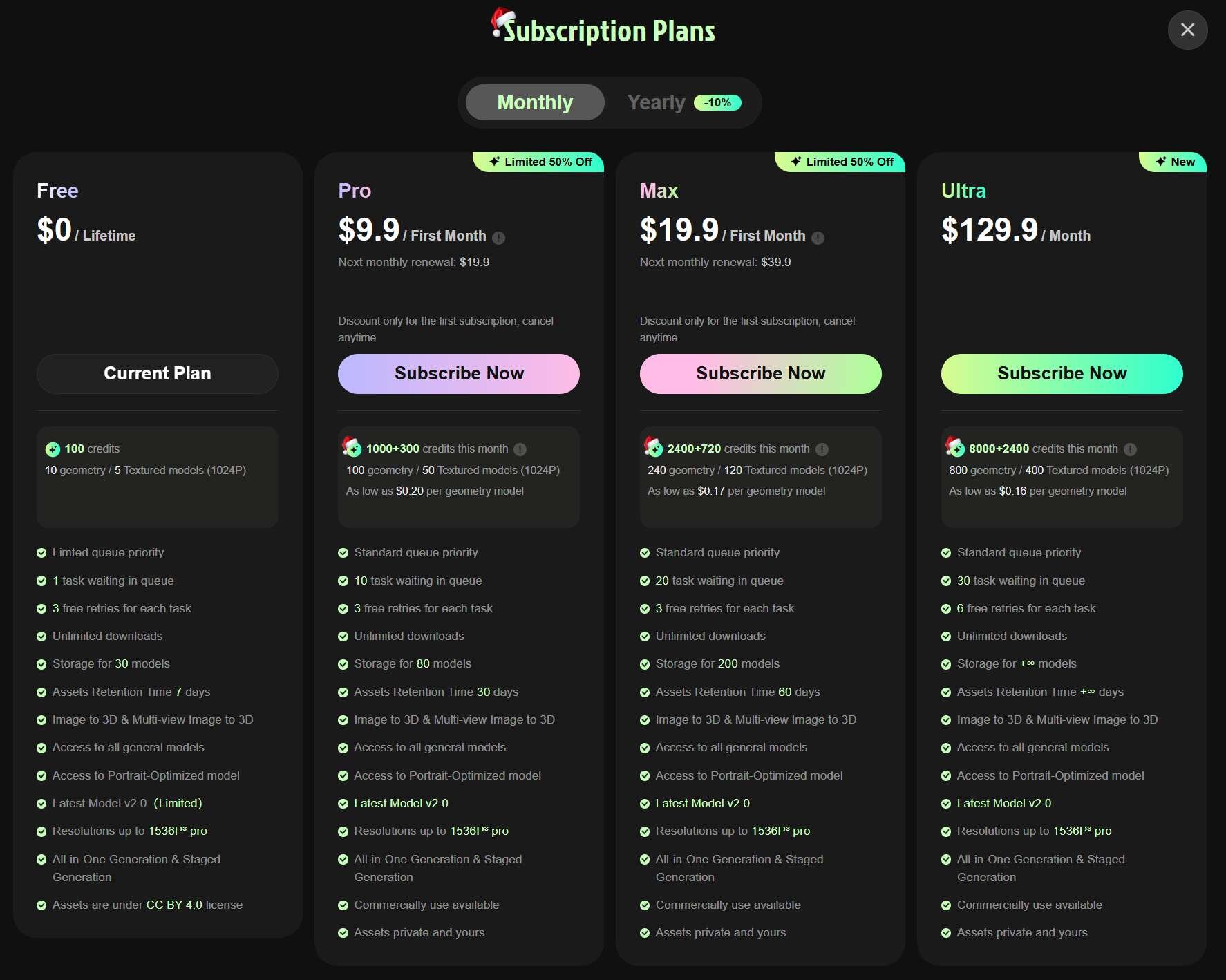 Web版公式ワークスペースでは、無料のFreeプランのほか、有料プランが3種用意されている。Proプランは初月9.9ドル(約1,485円)、翌月以降は19.9ドル(約2,985円)で提供され、月間1,300クレジットと商用利用権が付与される。最上位のUltraプランは月額129.9ドル(約19,485円)で、10,400クレジットという大量のリソースと無制限のストレージ、最高のキュー優先度が提供される。なお、年額払い時には10%の割引が適用される。
