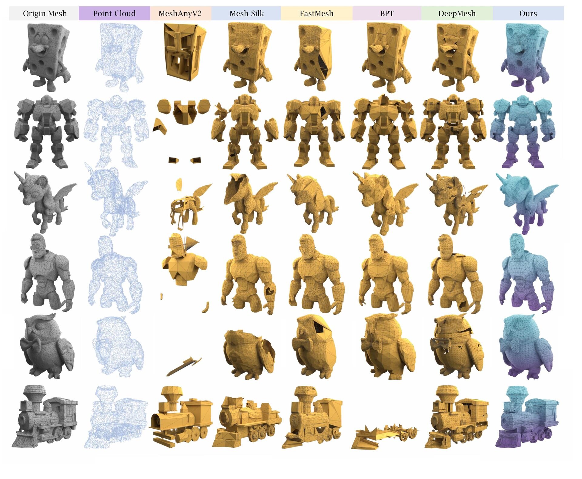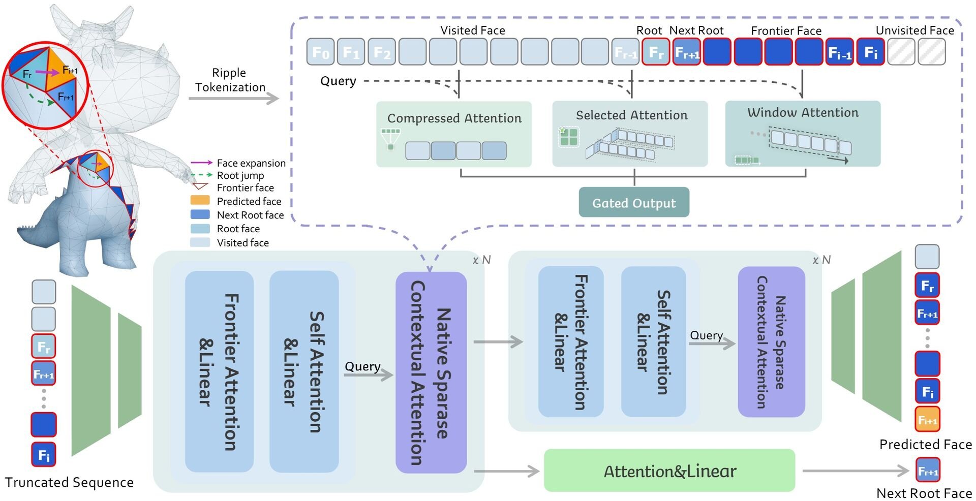 コアテクノロジーとして、トポロジーを考慮した「Breadth-First Search(BFS、幅優先探索)」によるトークン化を採用。3D形状の構造的な順序と生成プロセスを一致させ、自然な形状の拡張を実現する。また、「Sparse-Attention(スパース注意機構)」を用いたグローバルメモリを導入し、巨大で複雑なメッシュであっても、全体的な形状の整合性を保ちながら生成する。