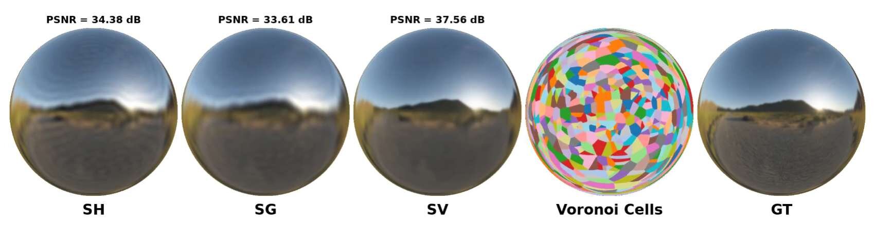 従来、この分野では球面調和関数(Spherical Harmonics)が標準的に用いられてきたが、鋭い反射などの高周波信号(High-frequency signals)の表現を苦手としており、不自然な振動(リンギング)が生じる課題があった。また、球面ガウス分布(Spherical Gaussians)などの代替手法は最適化が難しいという欠点があった。Spherical Voronoiは、球面上を学習可能な領域に適応的に分割(Partition)することでこれらの問題を解決し、滑らかな境界と明確に定義された勾配(Gradients)を持つことから、最適化が容易だという。