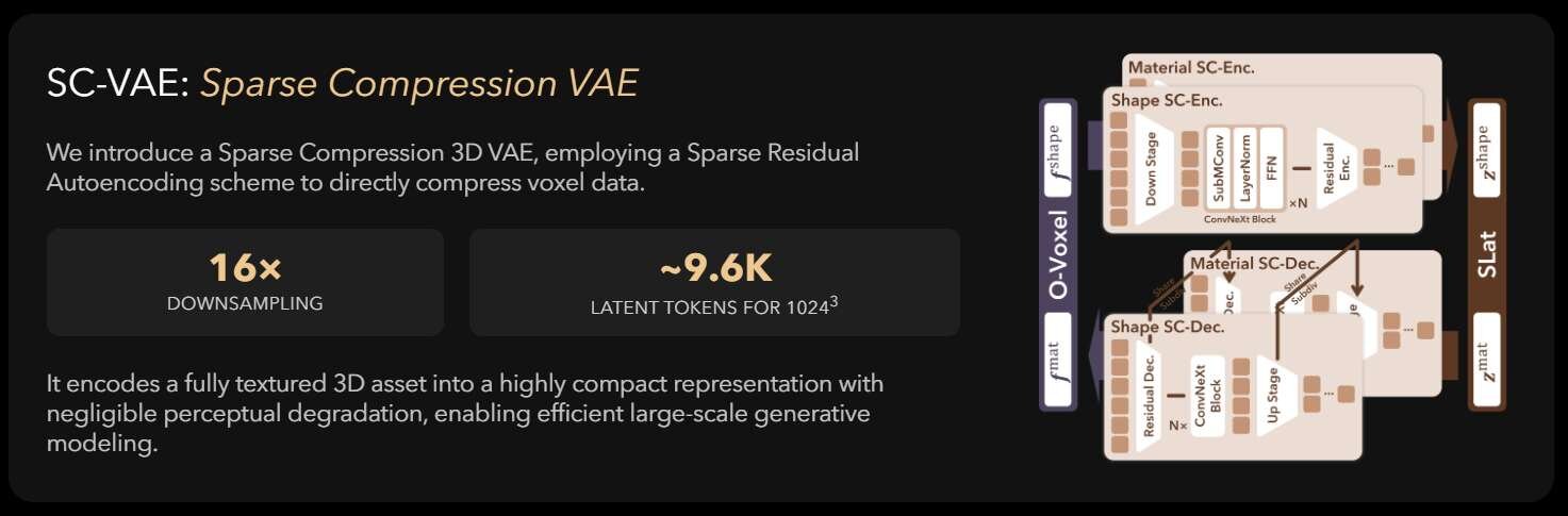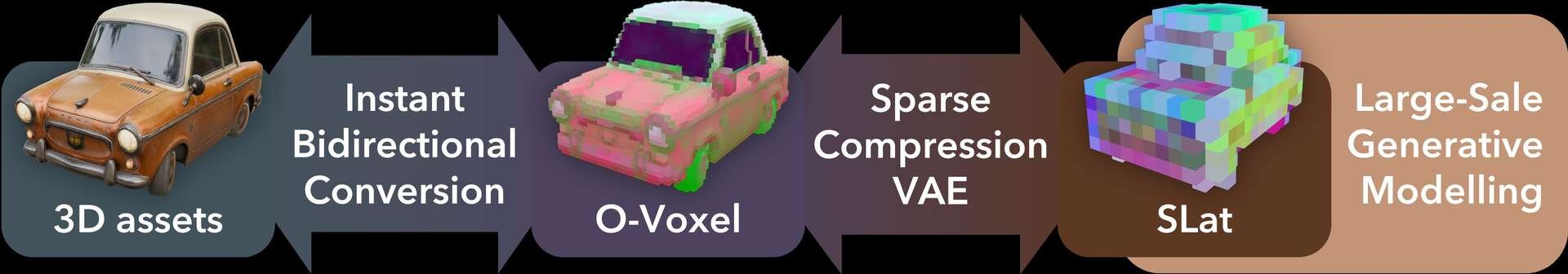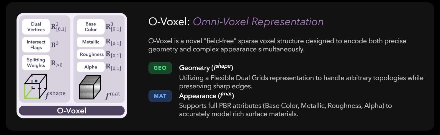 本モデルのコア技術は、全方向ボクセル(O-Voxel)と呼ばれる新たな3D表現形式。従来の等値面フィールド(Iso-surface fields)などが抱えていた、開いた曲面や非多様体形状(Non-manifold geometry)の表現が難しいという課題を克服するために採用された。さらに、構造化された3D潜在表現(Structured 3D Latents)と整流フロー変換器(Rectified Flow Transformers)を組み合わせることで、高解像度かつ忠実度の高い3D生成を実現している。