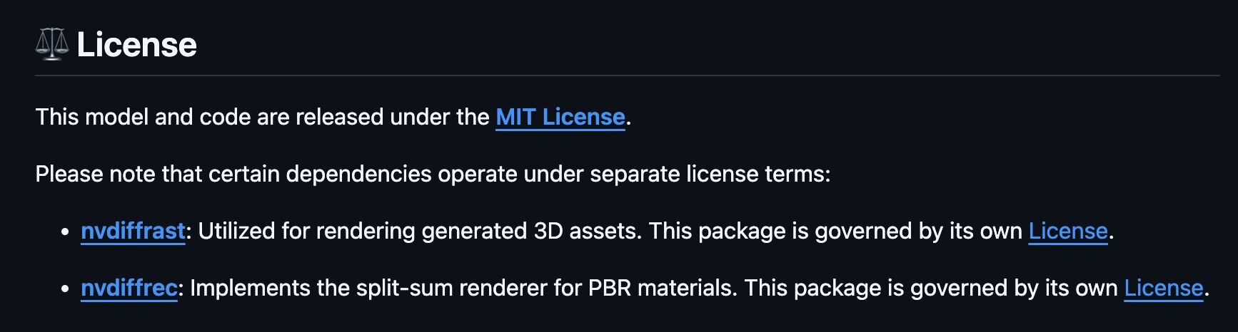 TRELLIS.2のモデル本体とソースコードはMITライセンスの下で公開されており、通常であれば商用利用や改変が自由に行える。しかし本モデルは、レンダリングやマテリアル処理のためにNVIDIA製のライブラリである「nvdiffrast」および「nvdiffrec」に依存しており、これらはそれぞれ「NVIDIA Source Code License」という独自のライセンスでの提供となる。