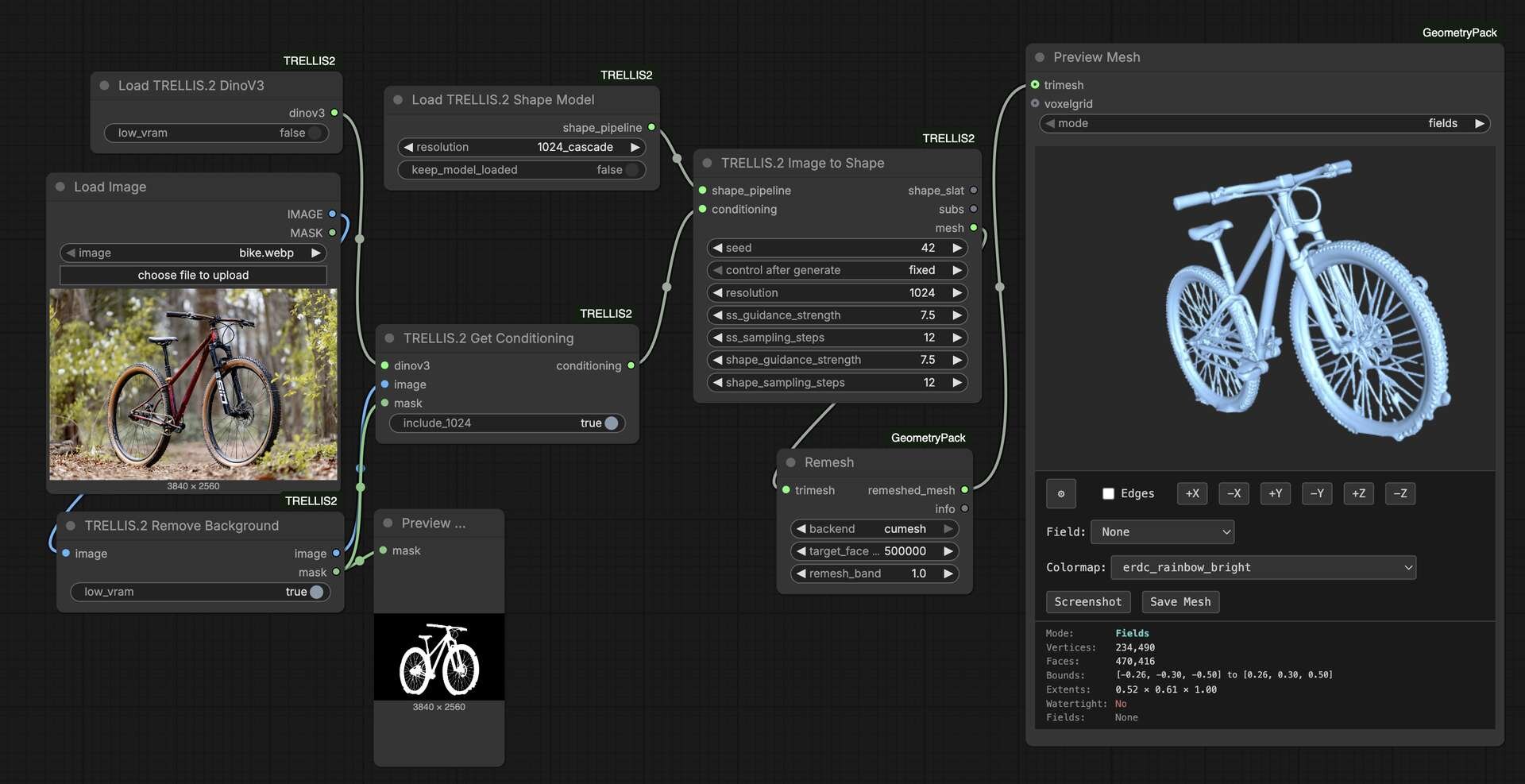 Pozzetti Andrea氏は画像生成AIのGUI環境であるComfyUI向けのカスタムノード「ComfyUI-TRELLIS2」をGitHubで公開している。ComfyUI-TRELLIS2を使用すると、ユーザーは複雑なコマンド操作を行うことなく、ノードベースのインターフェイス上でTRELLIS.2を利用できる。VRAM 8GBのGPUでも動作可能とのこと。