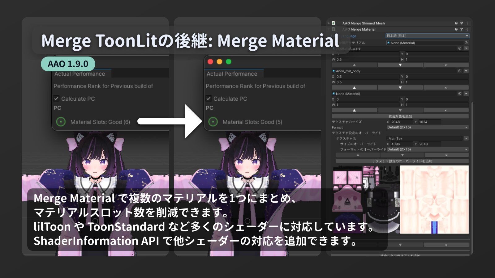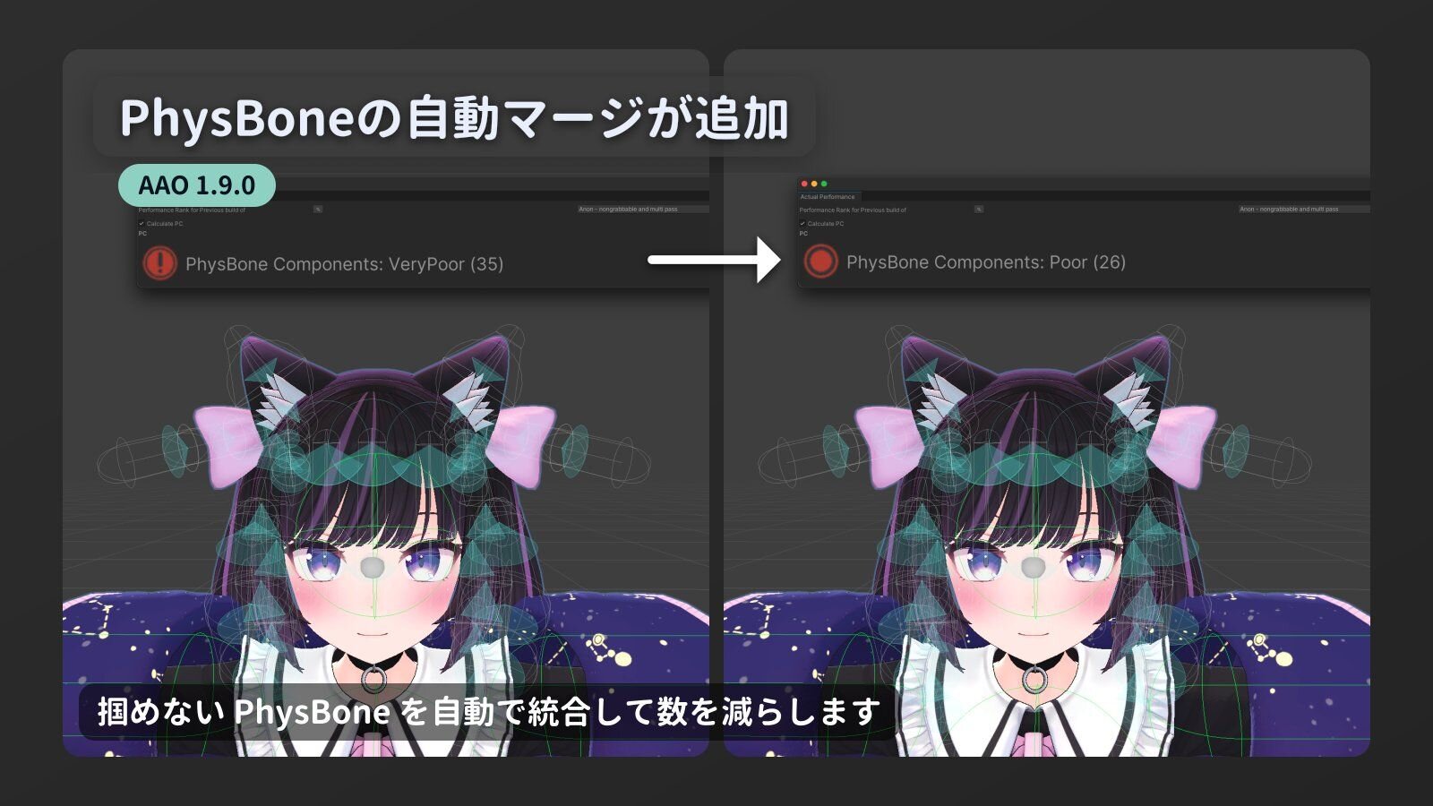 anatawa12氏は2月12日(木)、オープンソース(MITライセンス)のUnityエディタ拡張「AAO: Avatar Optimizer v1.9.0」をリリースした。本バージョンでは、Animator最適化の強化やPhysBoneの自動マージ、自動Freeze強化、Remove MeshのBasic Mesh対応(一部)、Merge Material、Max Texture Sizeなどの機能拡張が盛り込まれている。なお、執筆現在の最新バージョンは2/19付のv1.9.6で、v1.9.0からの更新内容については、バグ報告用データ収集ウィンドウの情報拡充を除き、全てバグフィックスとなっている。