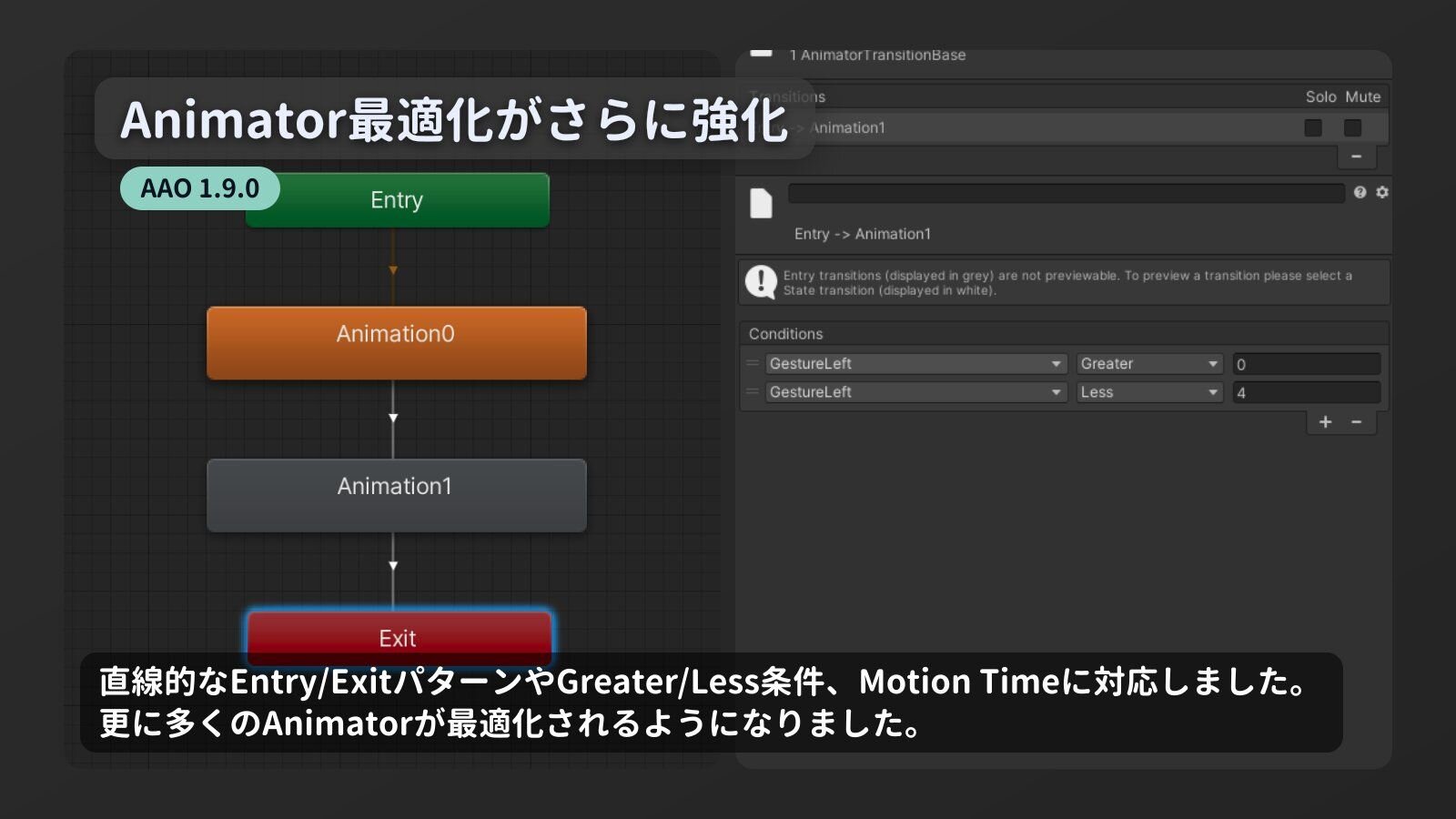 「AAO: Avatar Optimizer v1.9.0」では、アバターの動きを制御するAnimatorの最適化機能が強化され、アニメーター内の状態遷移における計算負荷を軽減するため、複雑なグラフ構造をより単純なEntry/Exitの最適化へ自動変換する範囲が拡大。また、特定の値に応じて動きを補間する1D BlendTreeへの対応や、動作の再生時間を制御するMotion Timeの適切な処理を実装した。